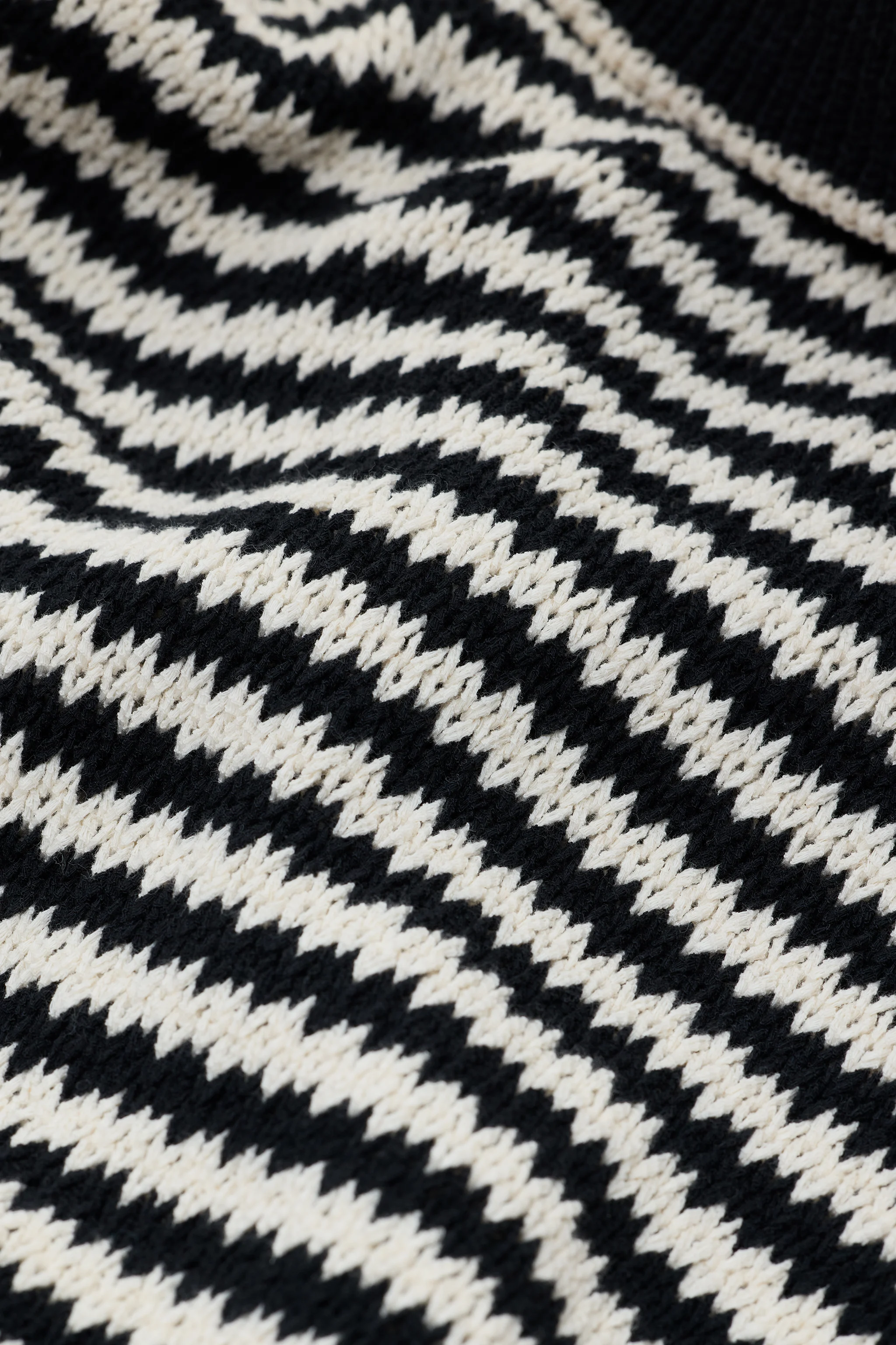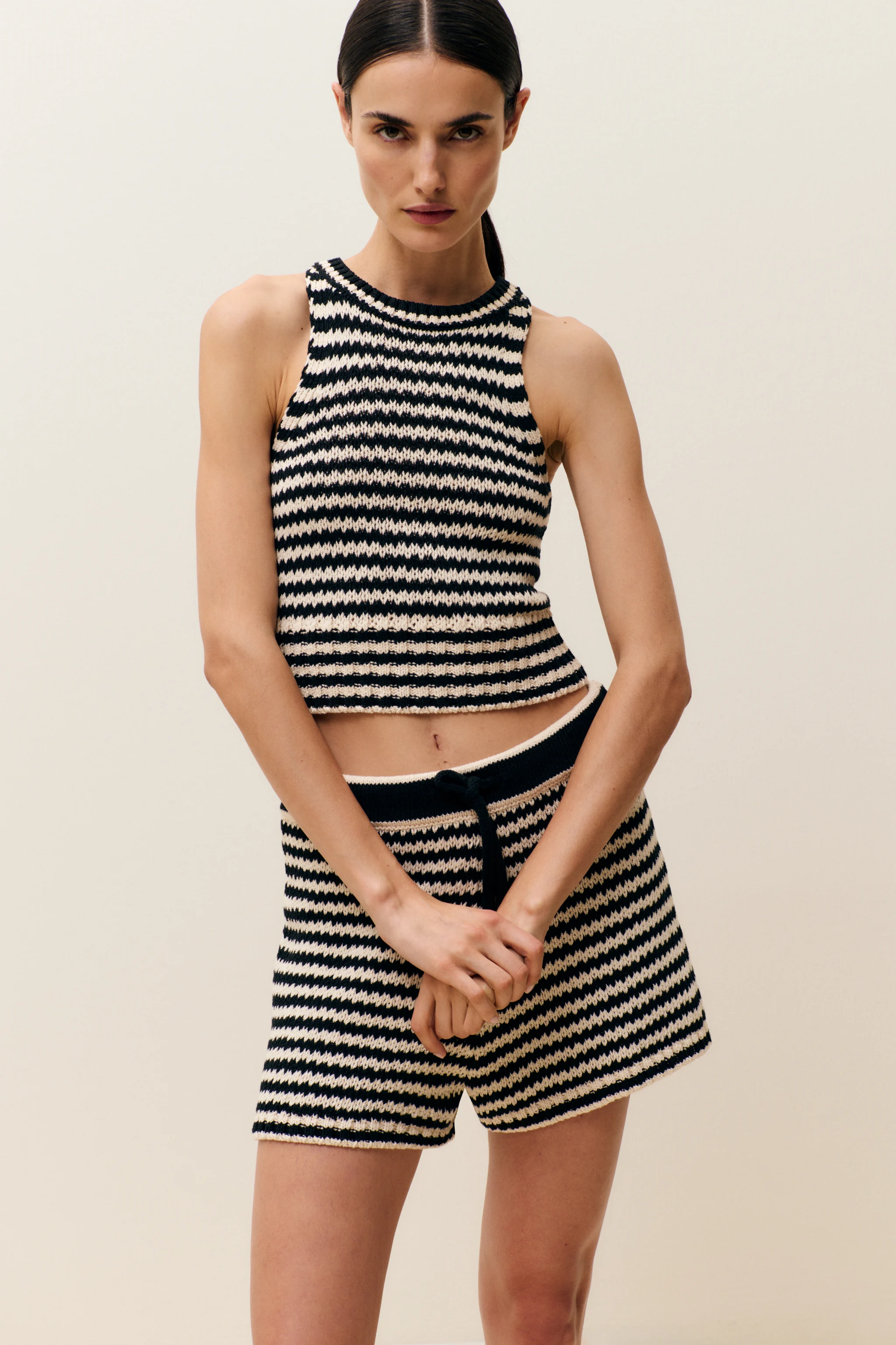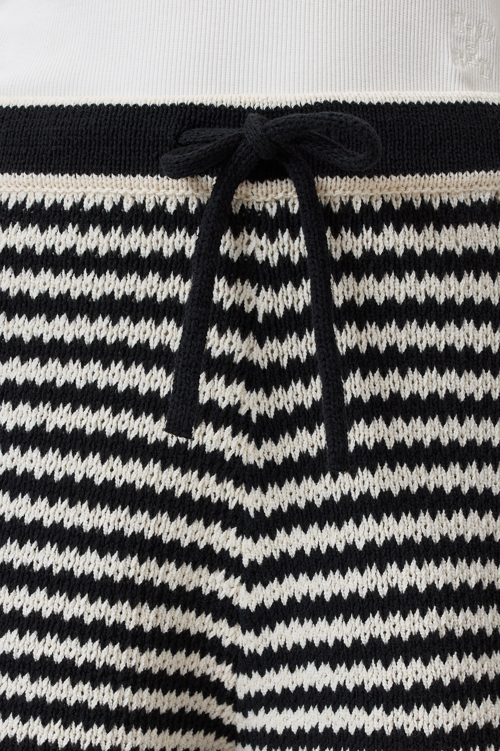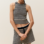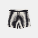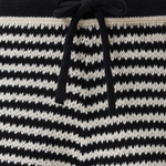 Our shorts in a relaxed fit are made from organic Italian cotton in a chunky crochet knit (3 gg). In a jagged striped pattern with a drawstring, wide cuffs at the hem and a narrow hem at the end of the leg. Can be worn as a set with the matching knitted top.