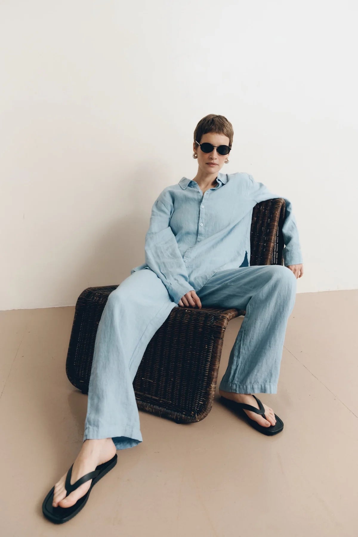 The Delphine Linen Pant blends ease with elevated style. Designed with a relaxed, straight-leg fit, these trousers feature an elastic waistband and drawcord for a personalized, comfortable fit. The loose silhouette effortlessly drapes down to a refined, ankle-grazing length, striking the perfect balance between casual and sophisticated. Made from our signature linen, these pants offer breathability and fluidity, making them the ideal companion for warmer days.