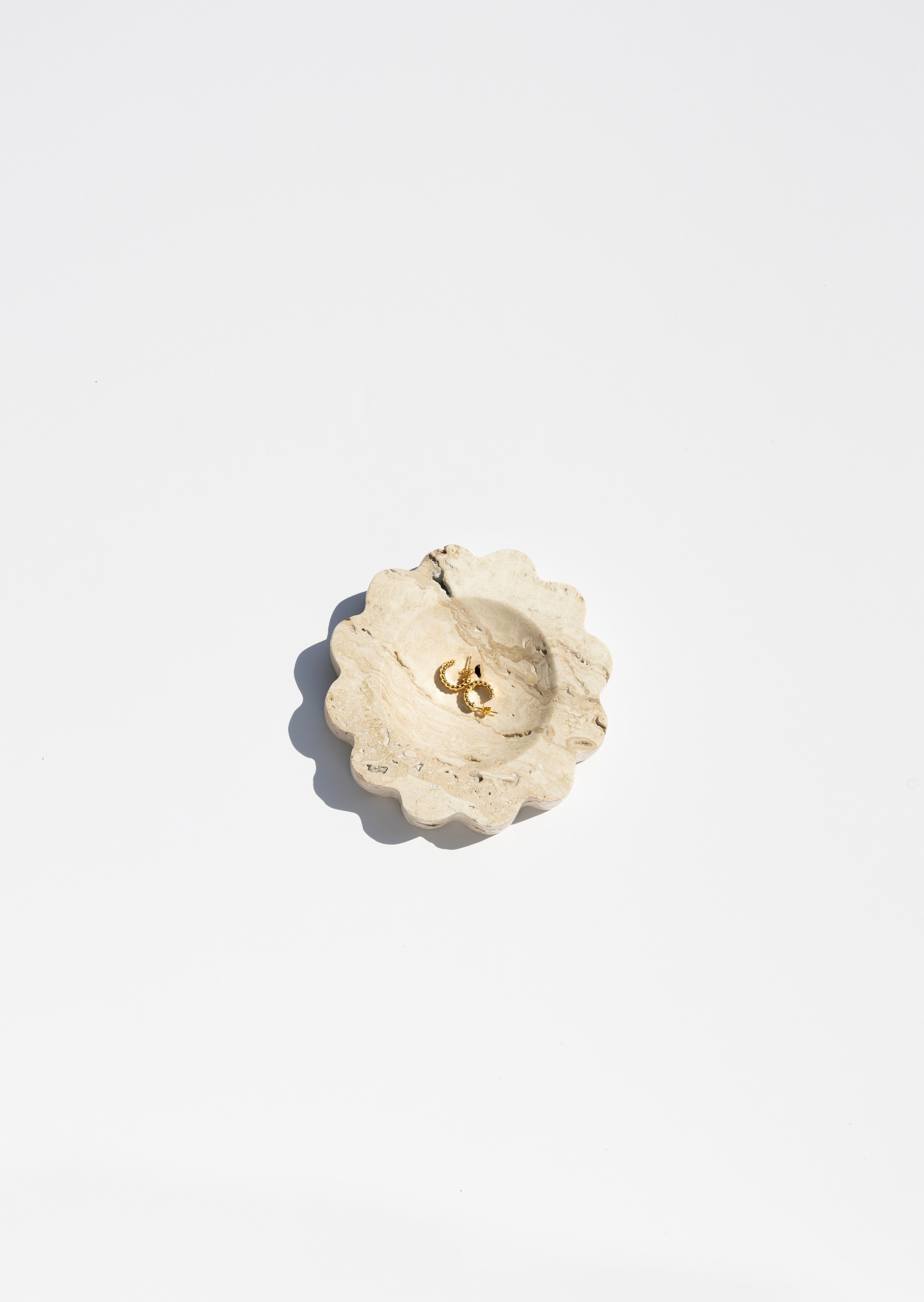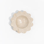 The Mini Sun is a sculptural five-inch round catchall cut from a single piece of solid marble or stone with scalloped edges, hand-finished by artisans in a growing stone atelier in Rajasthan, India.