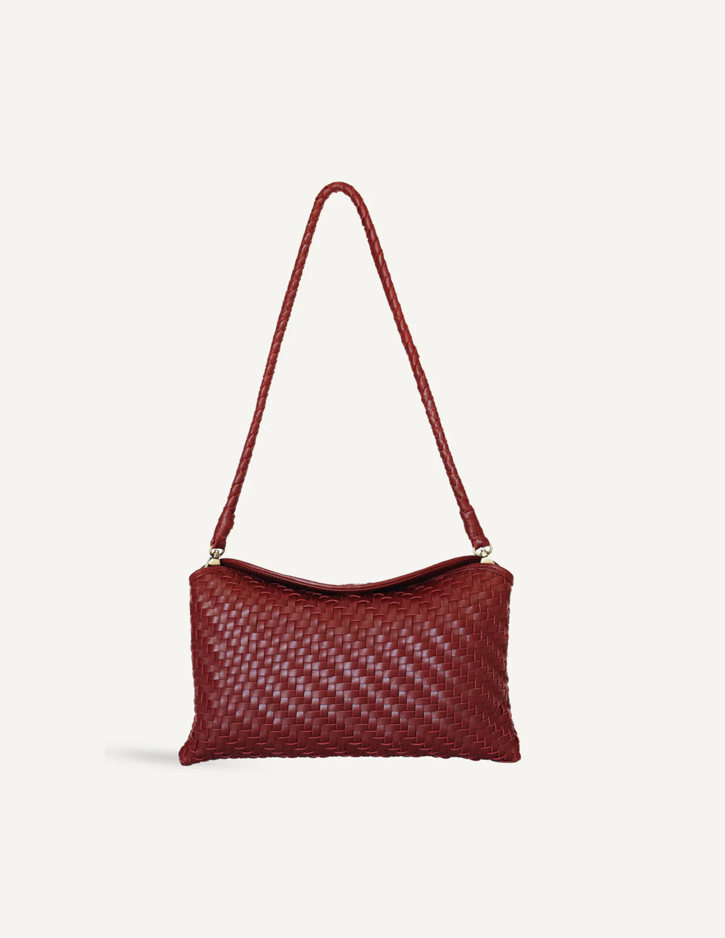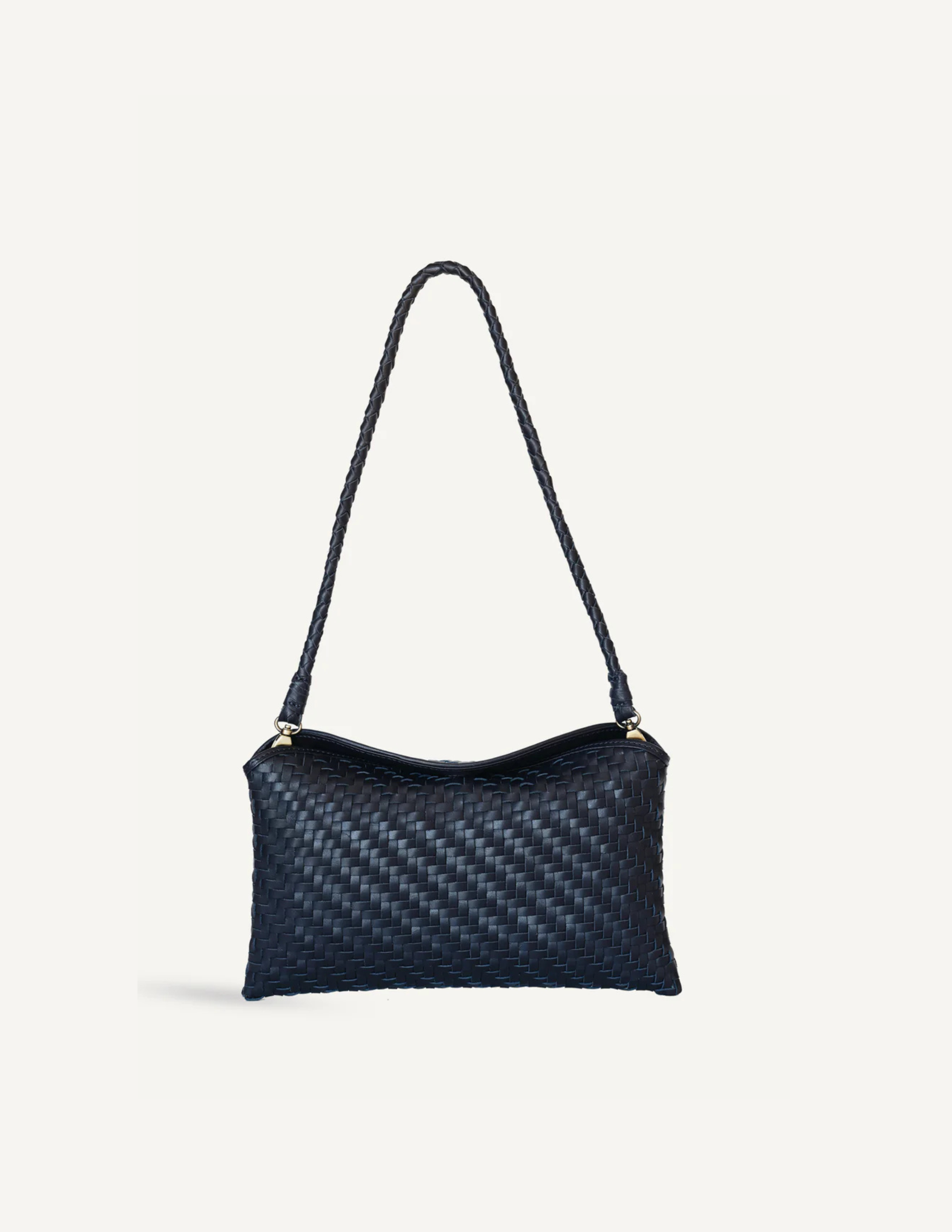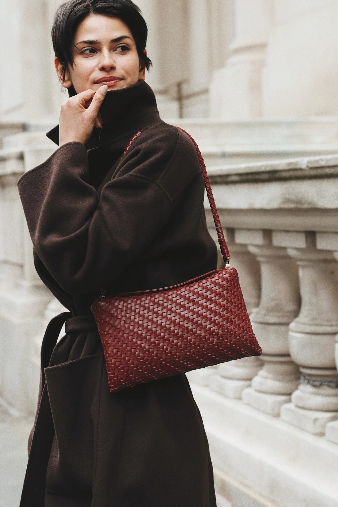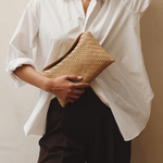 Fold-over flap clutch bag with a removable shoulder strap, so you can wear it two ways. Made from handwoven leather with a magnetic closure in an architectural, structured shape.
