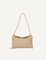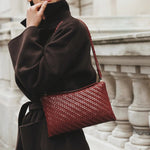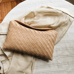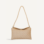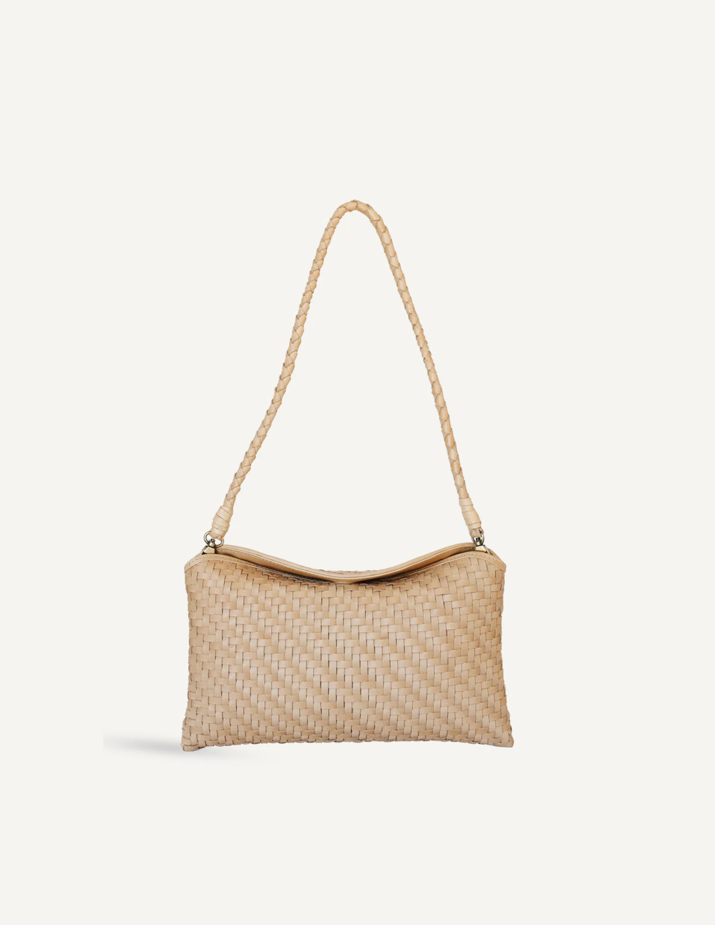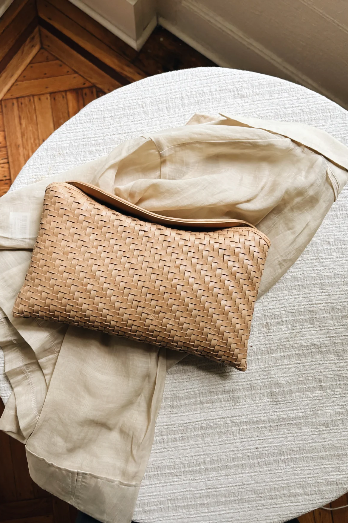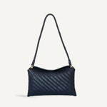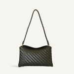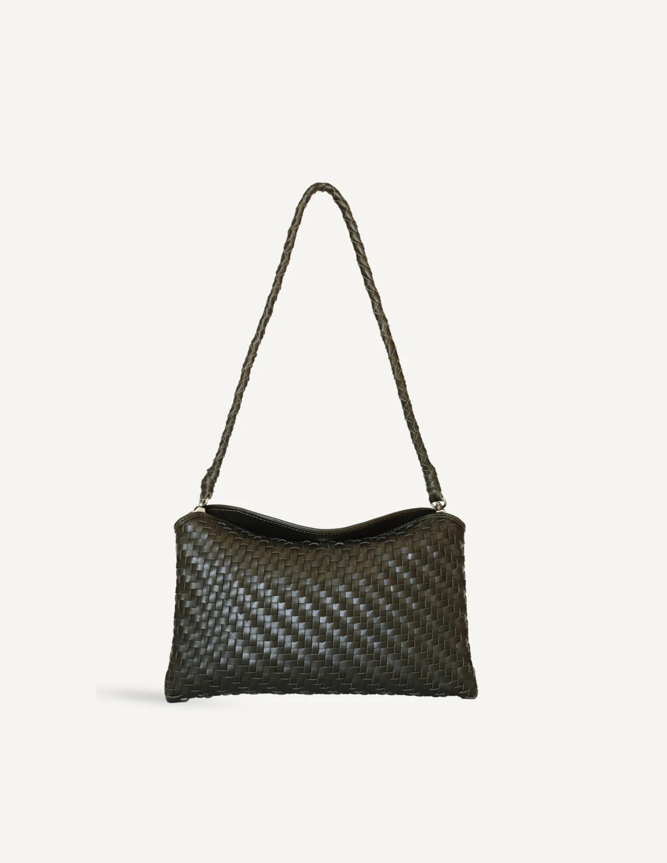 Fold-over flap clutch bag with a removable shoulder strap, so you can wear it two ways. Made from handwoven leather with a magnetic closure in an architectural, structured shape.