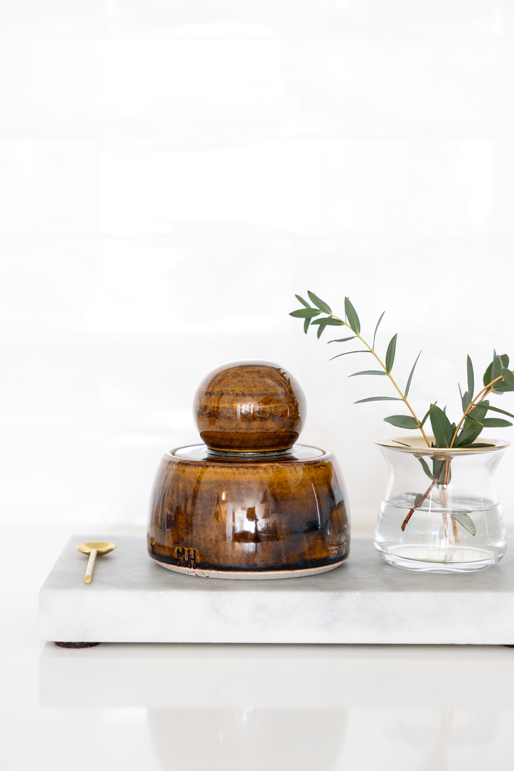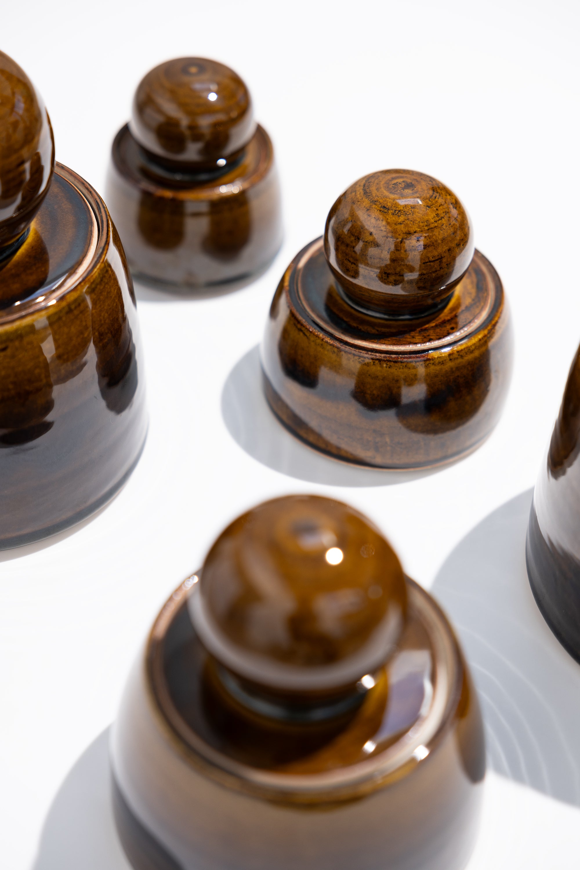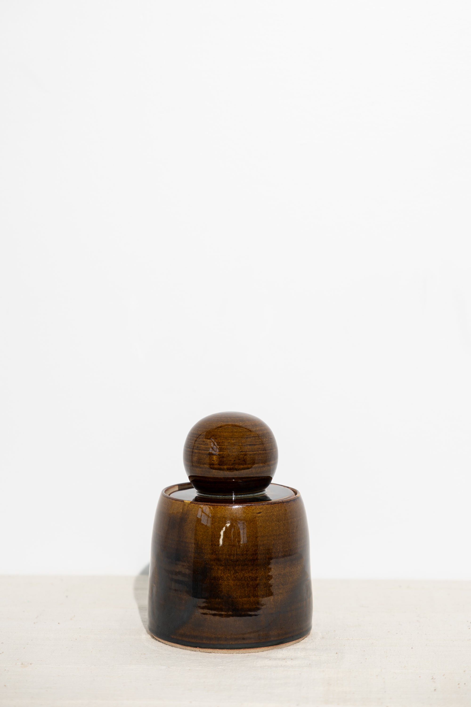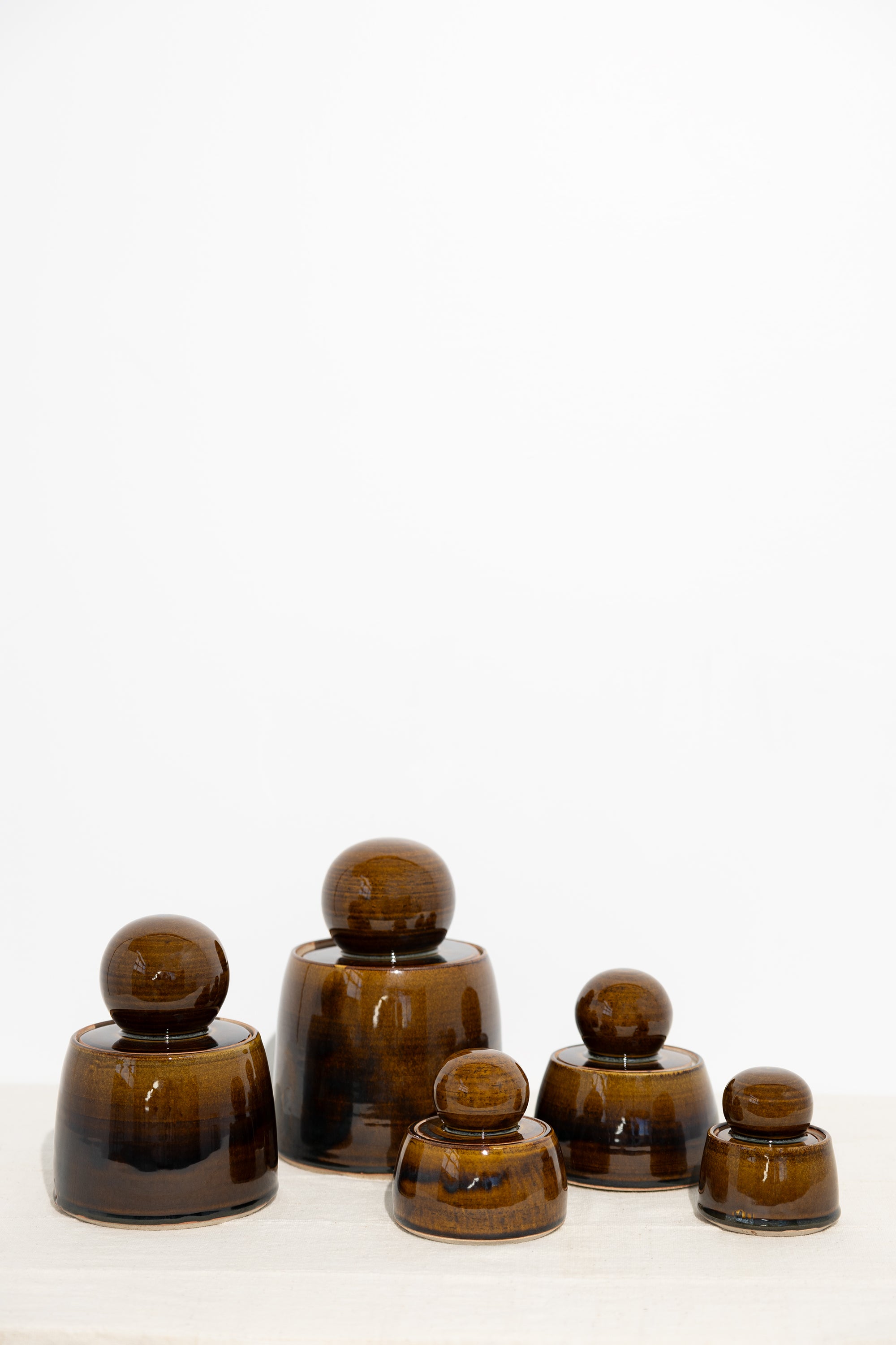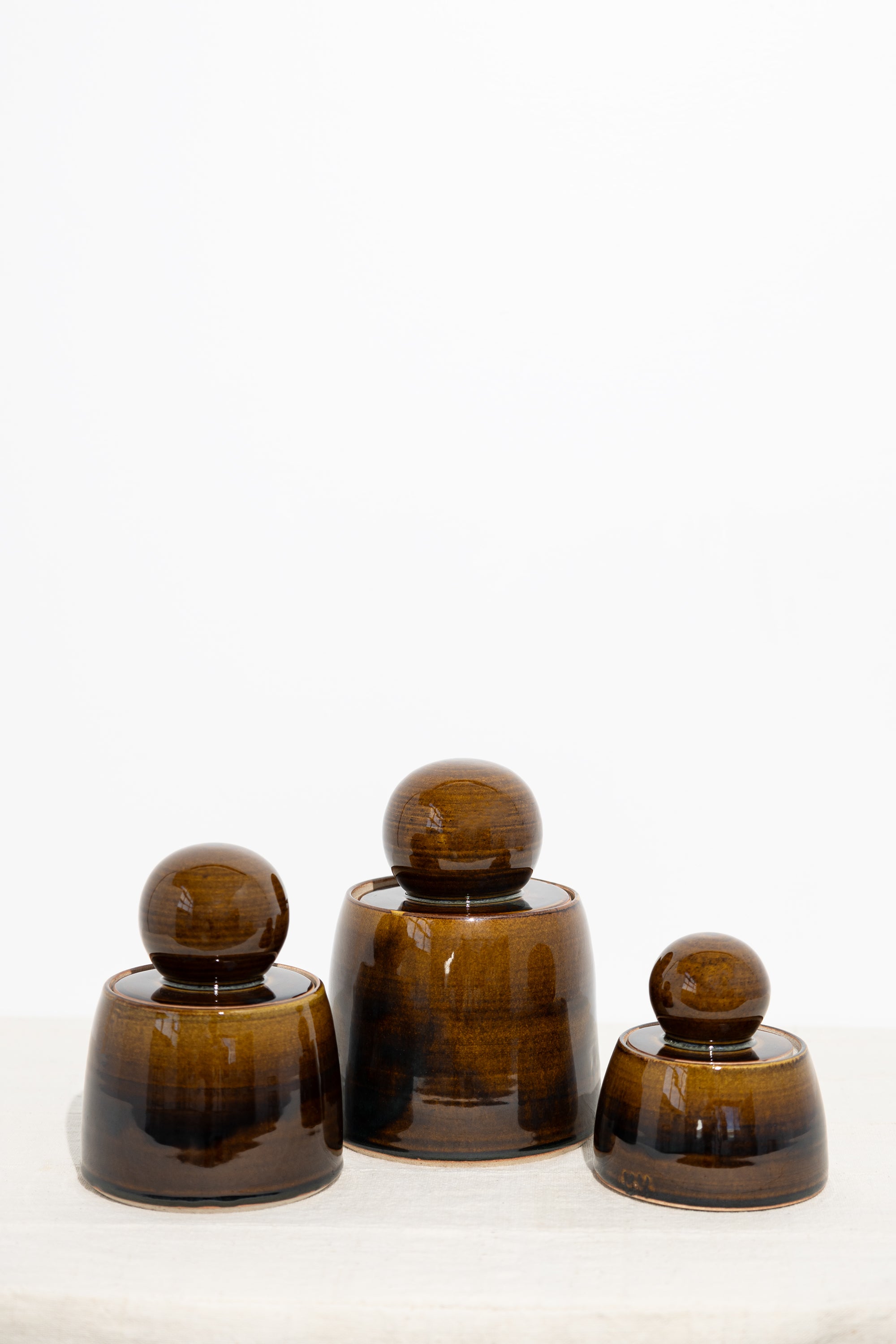 MH STUDIO hand-thrown jars are thrown from a chocolate brown stoneware. They are accented with large chunky knobs and finished with a satin glaze in shades of deep olive greens and browns.