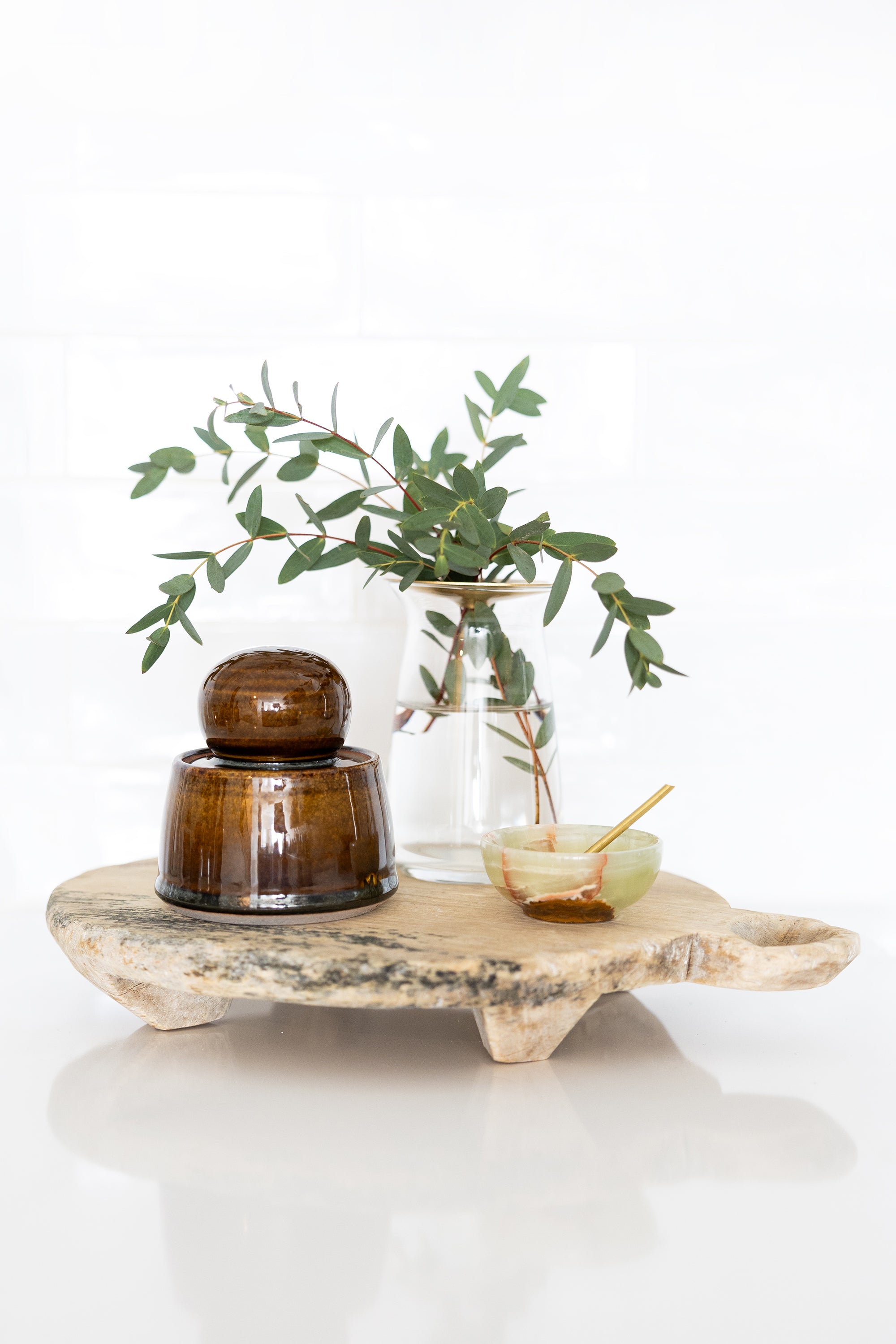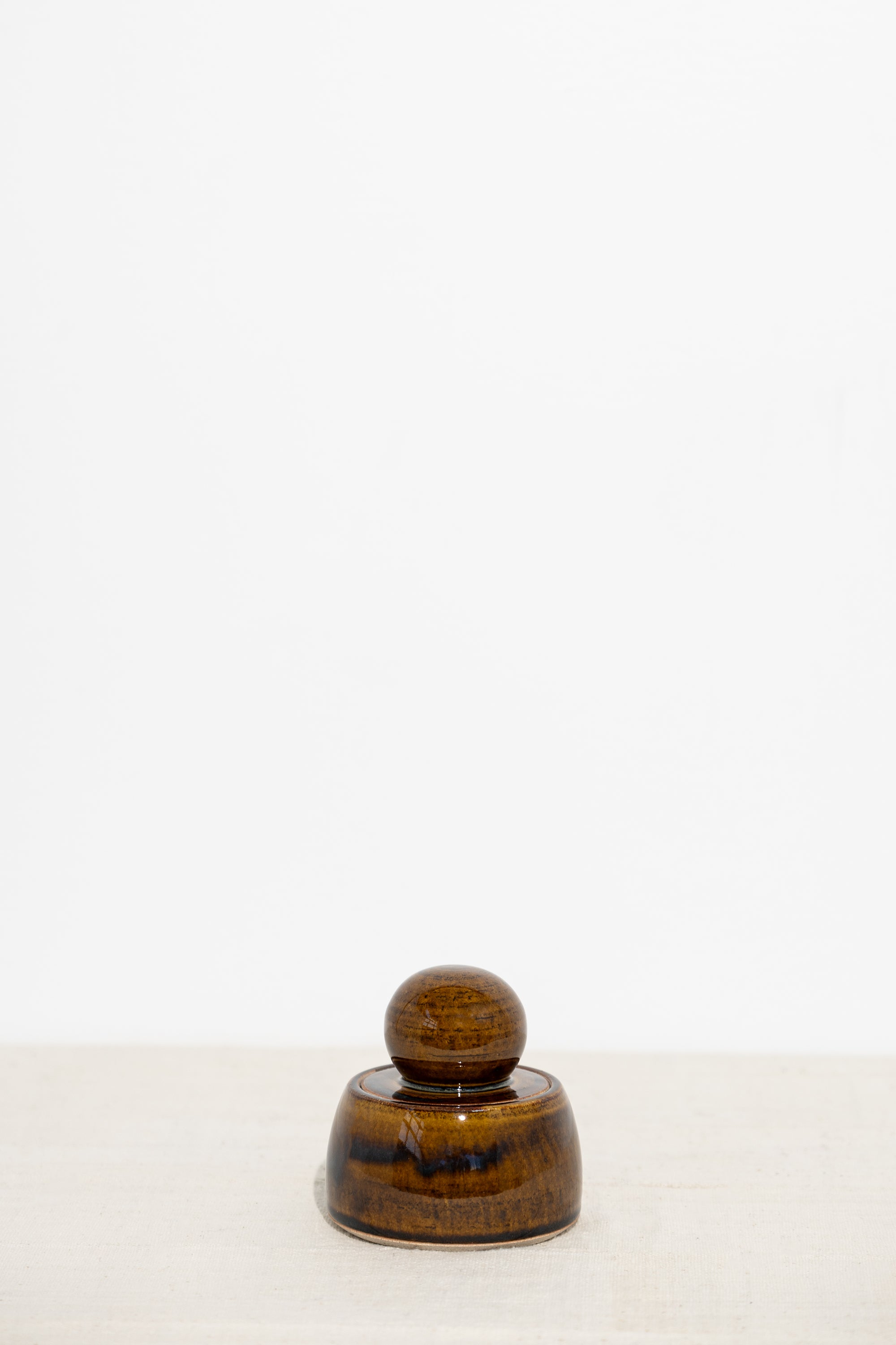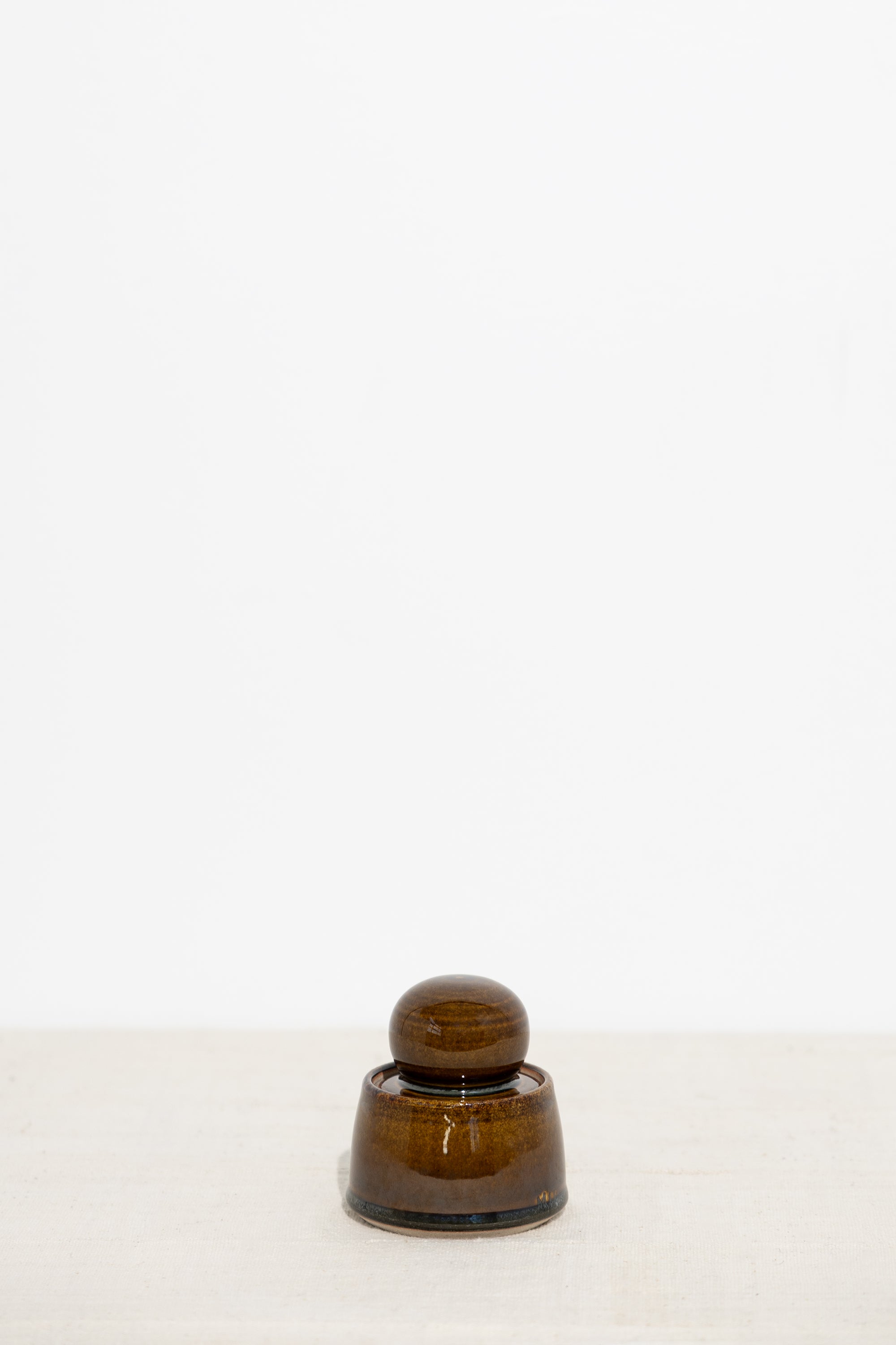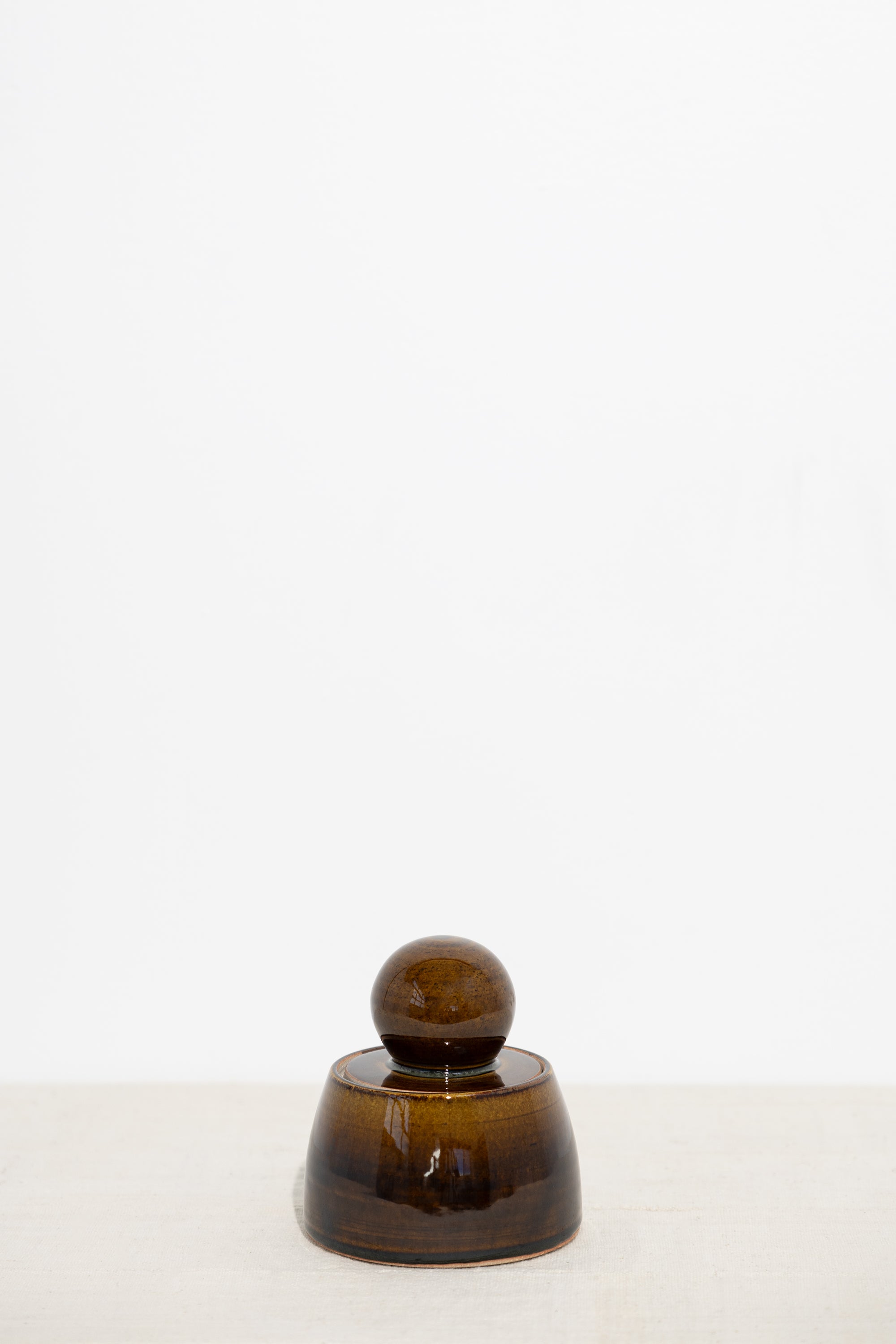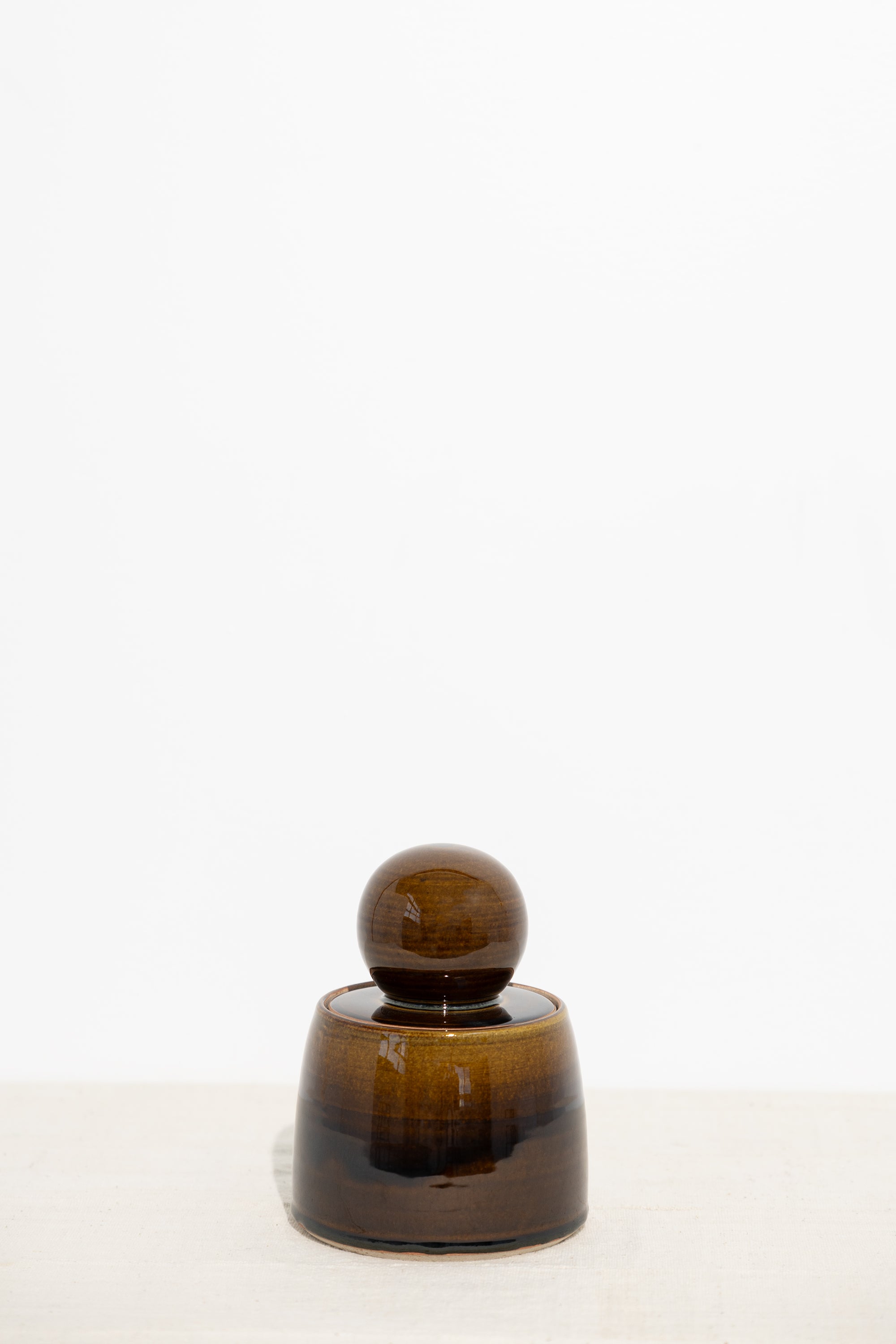 MH STUDIO hand-thrown jars are thrown from a chocolate brown stoneware. They are accented with large chunky knobs and finished with a satin glaze in shades of deep olive greens and browns.