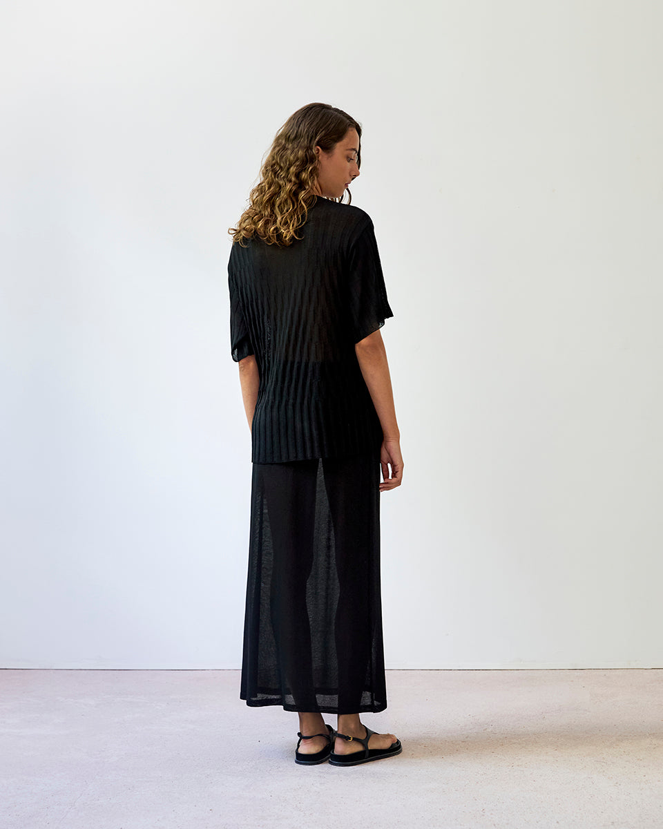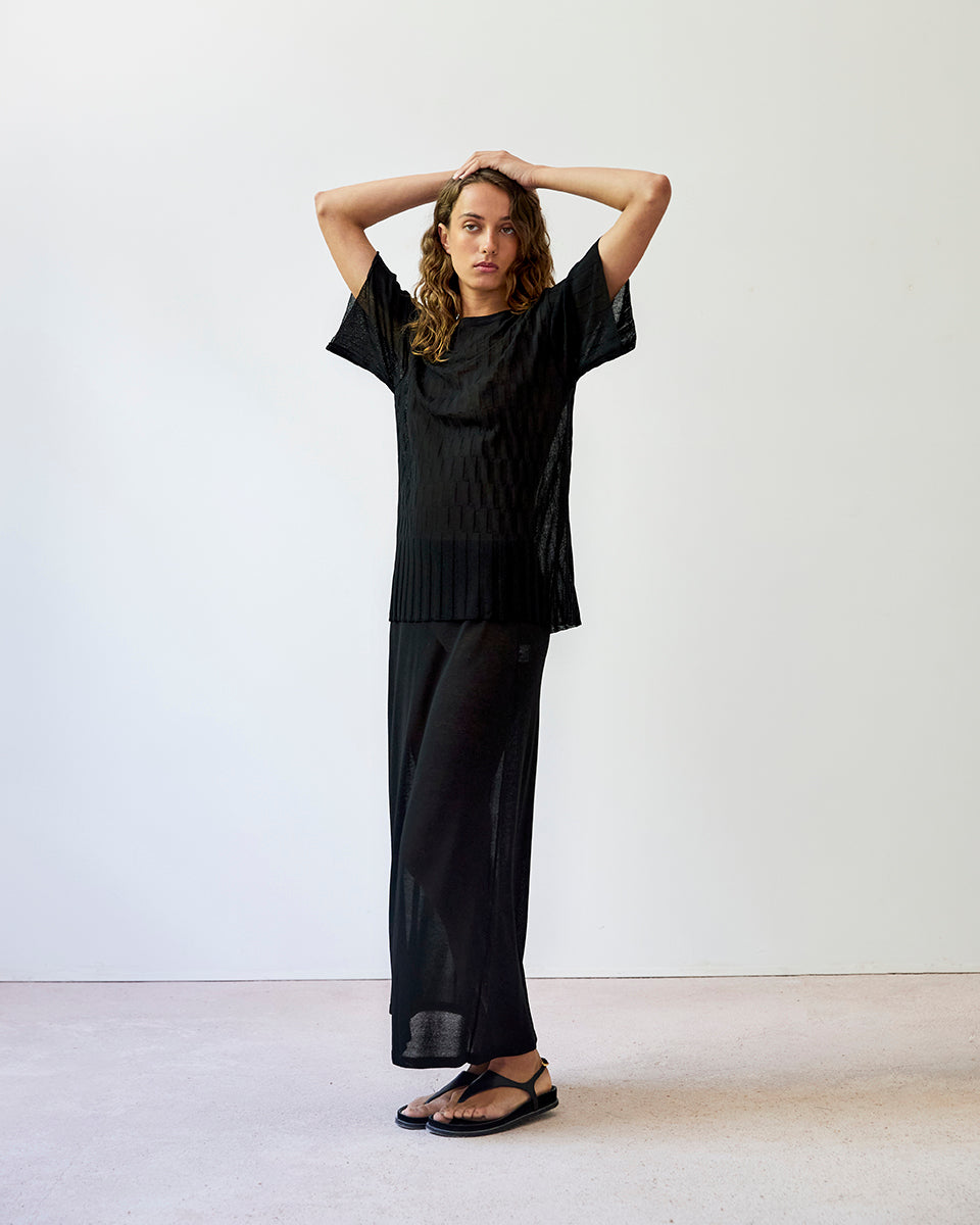 Short sleeve textured knitted top with an ethereal appeal crafted from a FSC lightweight viscose with fully-fashioned edges.
