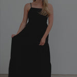 The perfect black linen dress, to be dressed up or dressed down! With a square neckline, thin and feminine strapped sleeves, and plunging low back, this dress is a celebration of carefree beauty and timeless style.