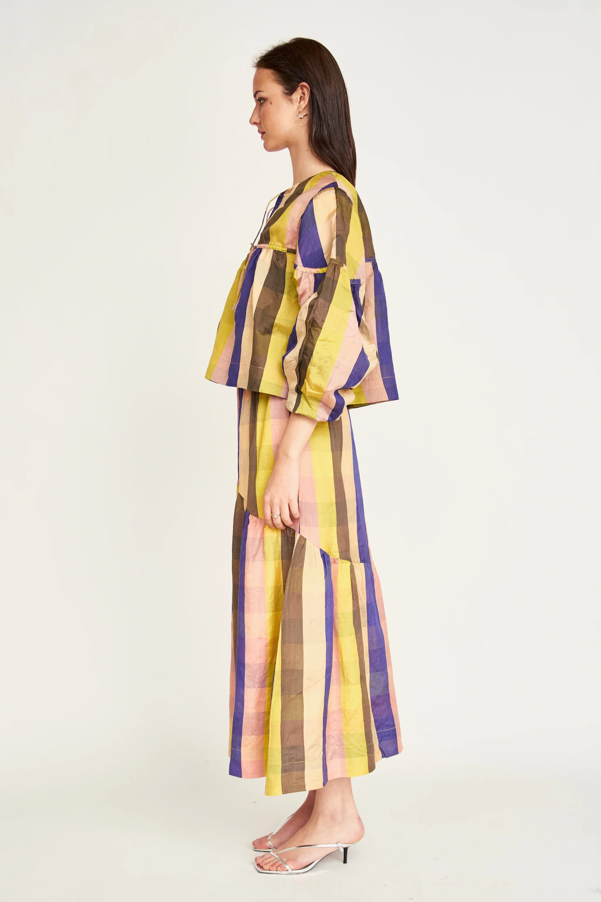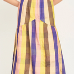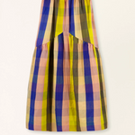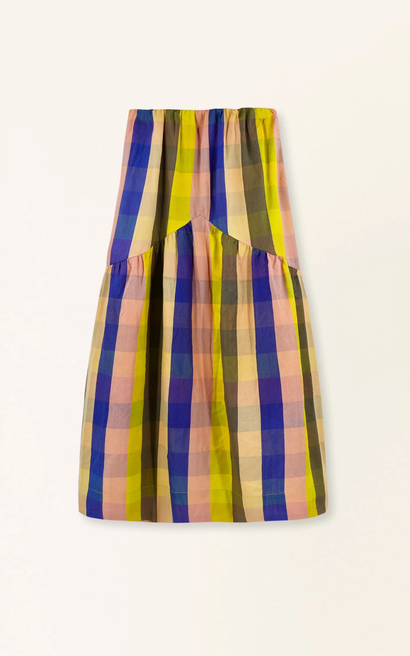 A softly gathered, tiered skirt with a hidden elastic waistband, pockets, and an easy, high-low hem. The hand-loomed plaid fabric adds subtle texture and color, creating an effortless statement piece.