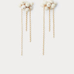 Cluster earrings featuring smooth acrylic beads and cascading gold-tone chains. A refined take on statement jewelry with subtle movement. Sold as a pair.