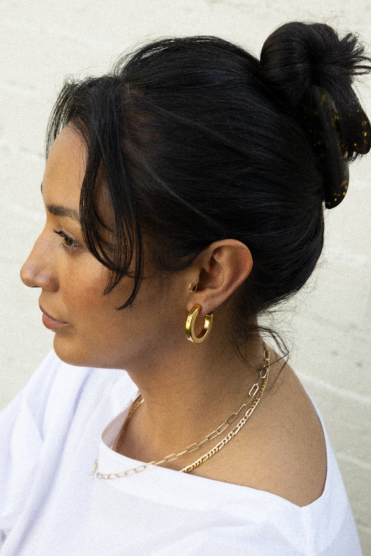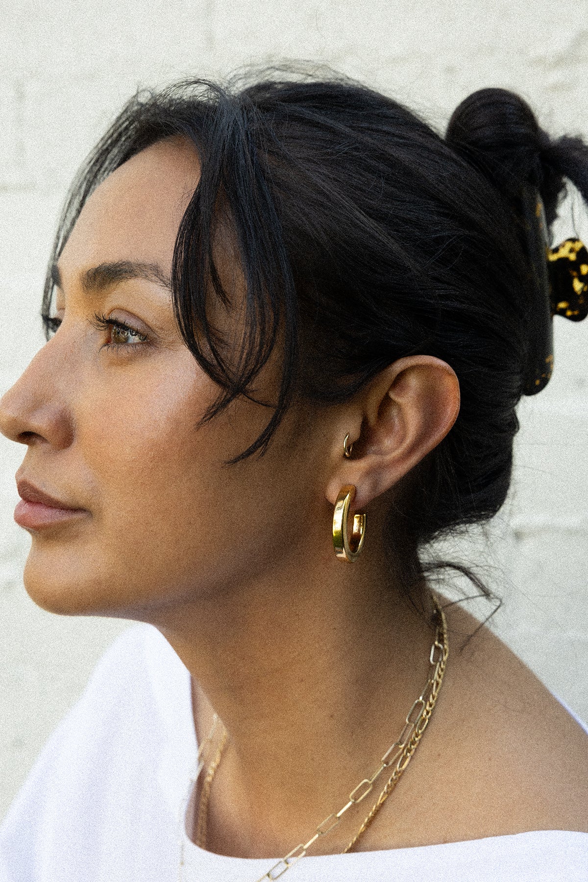 Smooth, shiny, and effortlessly bold. These 29mm chunky hoops bring that clean, modern gold moment that goes with absolutely everything. Easy, elevated, and made for everyday shine.