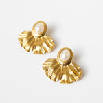 Soft pearl meets a bold golden fan. These 36mm statement studs feel vintage, feminine, and instantly dress up anything you wear. Sculptural, shiny, and made for your next “I need something pretty” day.