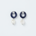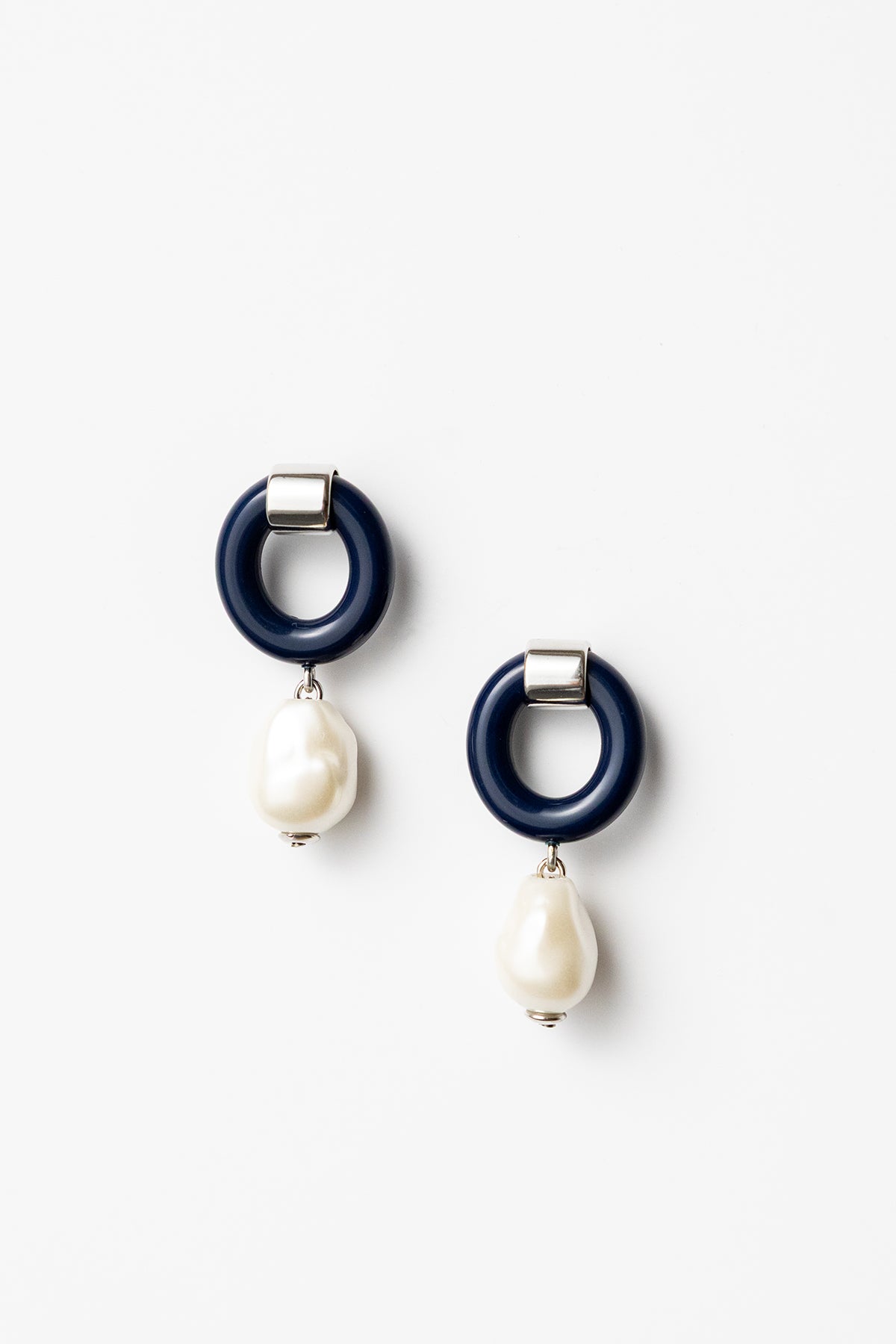 The Oli Earring in navy and white features 100% methacrylate and 100% surgical steel nickel with a latch and hook closure.