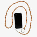 A chic phone necklace with elastic bands and threaded wooden beads, finished with a metal clasp and ring for functionality.