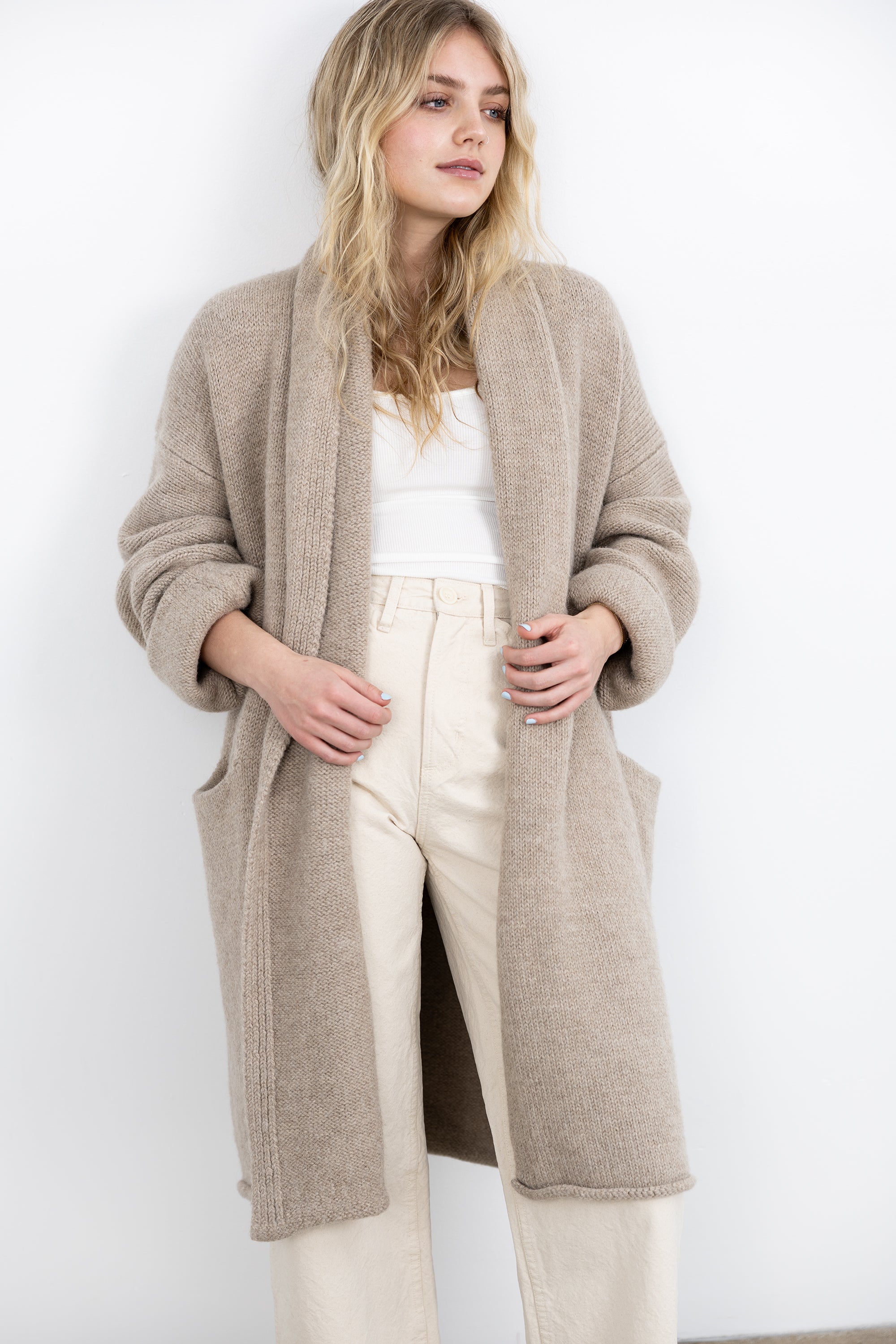 Crafted in partnership with producers in Peru with fair trade and sustainability as one of its core points. With a luxuriously soft and cozy baby alpaca, the Jones Sweater Coat has an easy, effortless fit and a minimalist silhouette. Featuring dropped shoulders, two knitted front pockets, and an optional knitted belt for cinching, the Jones pairs beautifully with all your go-to closet staples--like jeans and a turtleneck, tank, or tee.