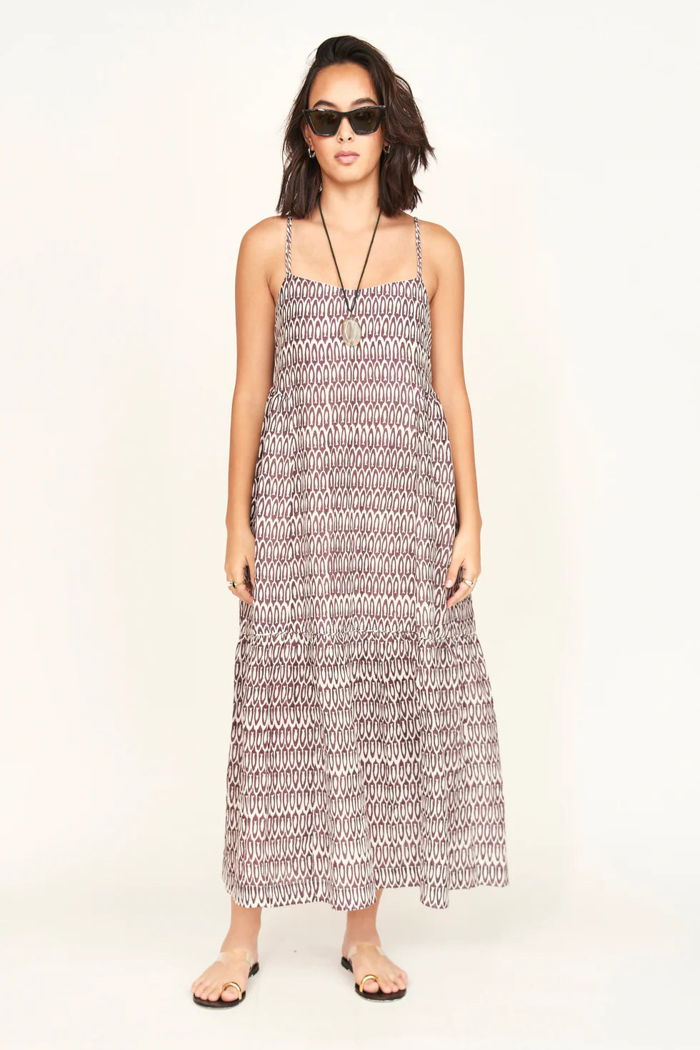 This ankle-length dress features a soft V neckline, adjustable rouleau tie straps, a gathered tiered skirt, side pockets, and a gathered elastic back for a comfortable, flattering fit.