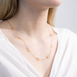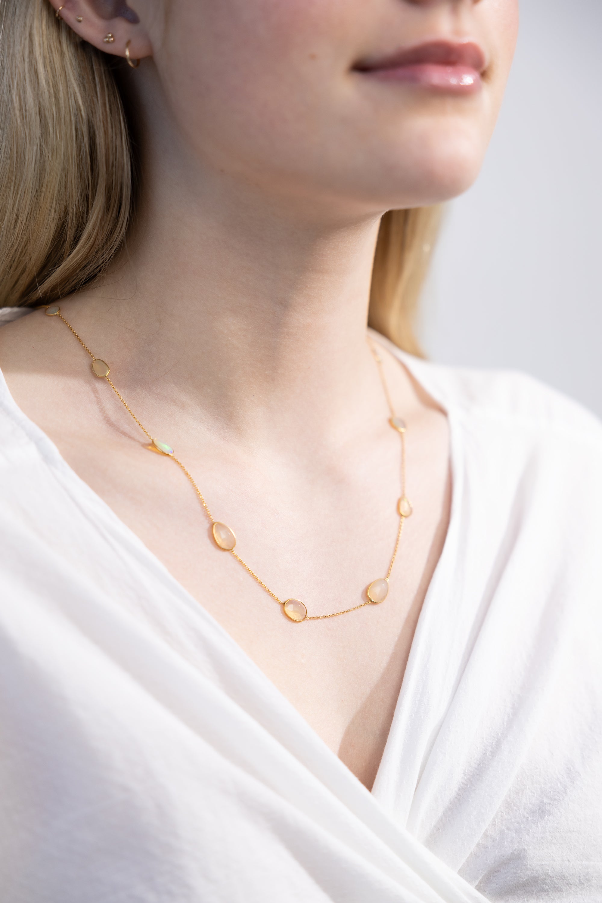 Add a touch of whimsy to your outfit with our 18k Gold and Opal Necklace. Made with high quality 18k gold and stunning opal, this necklace features a unique station design that will catch everyone's eye. Elevate your style with this one-of-a-kind piece.
