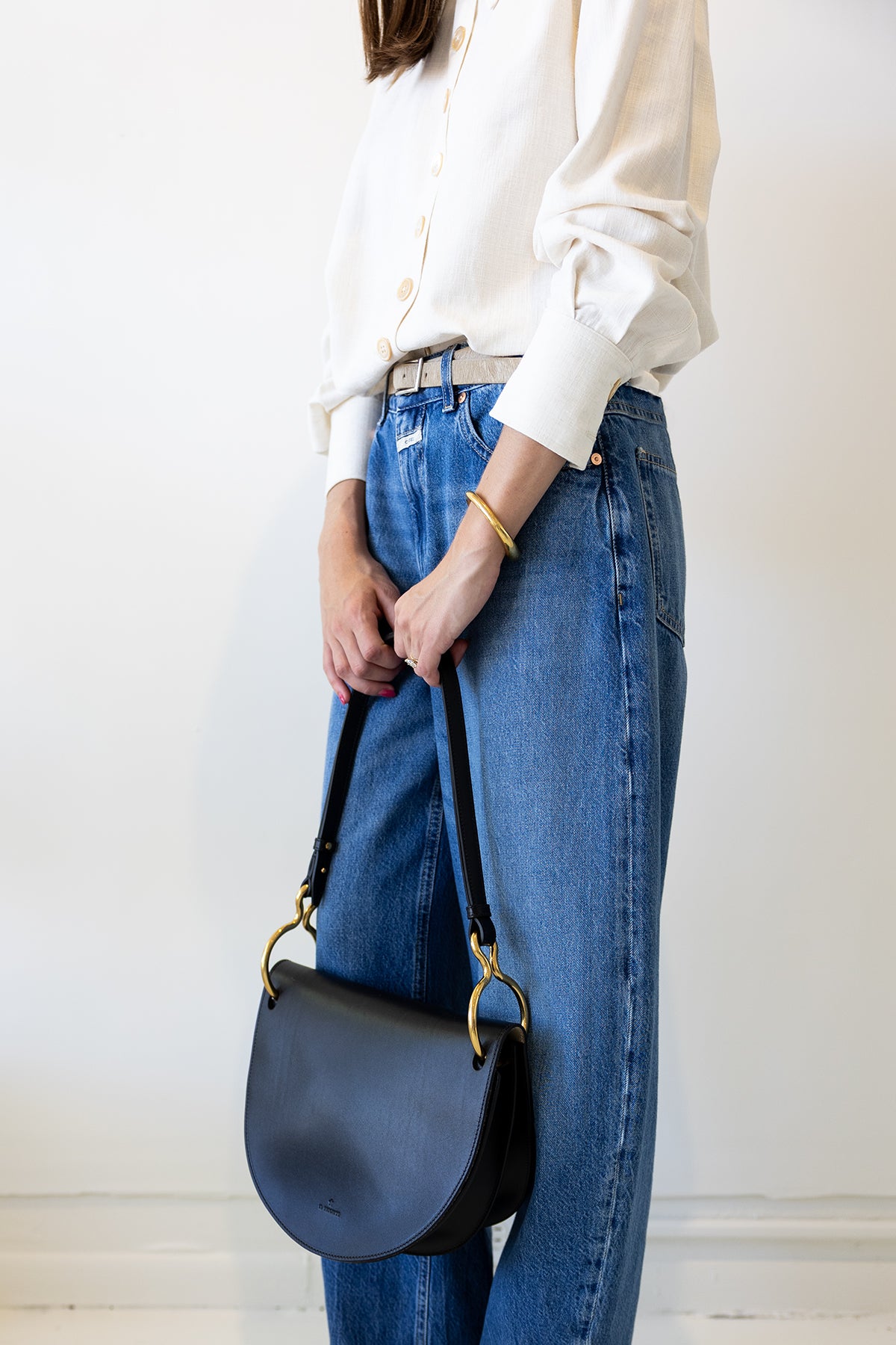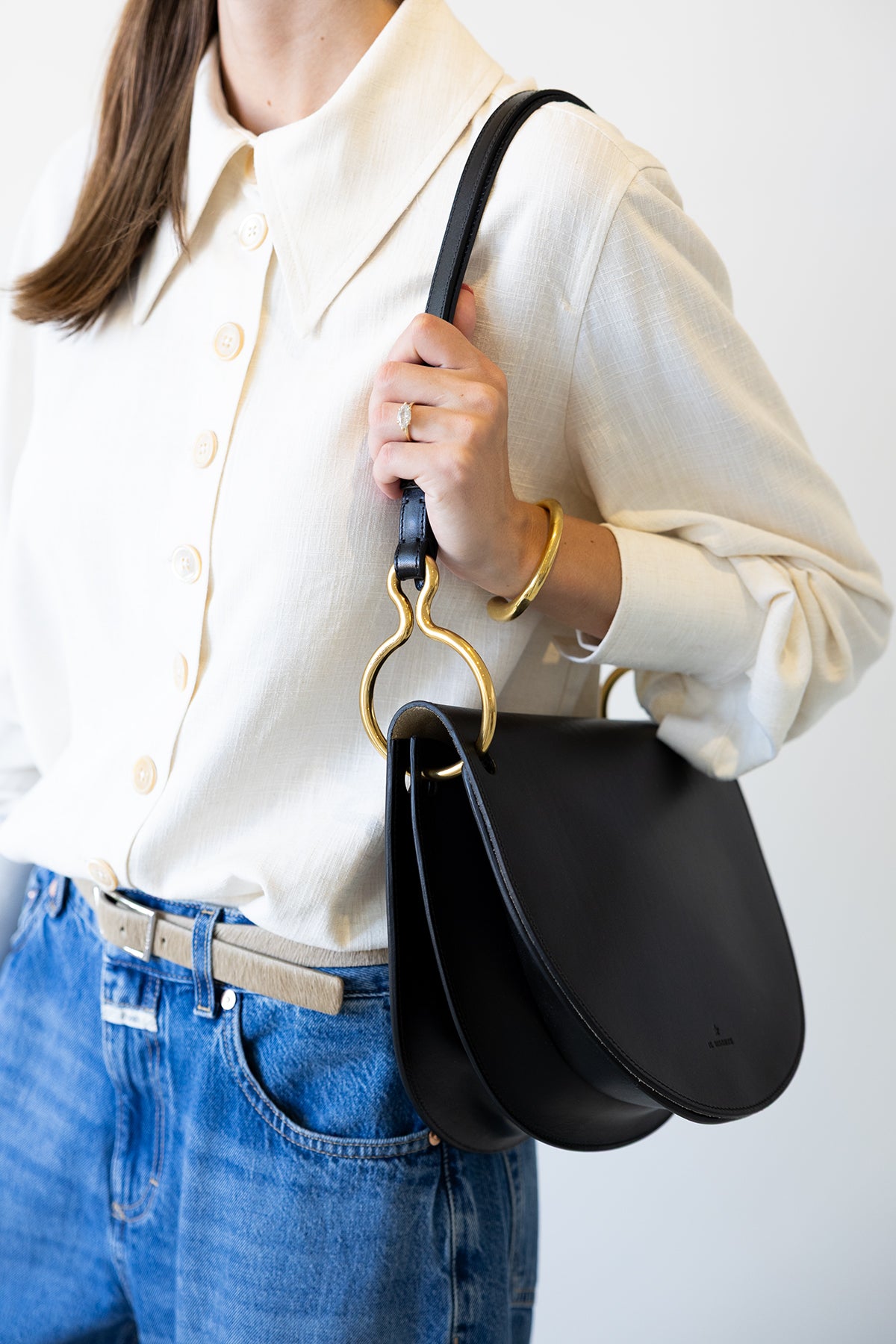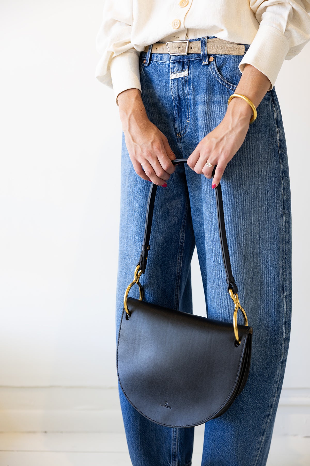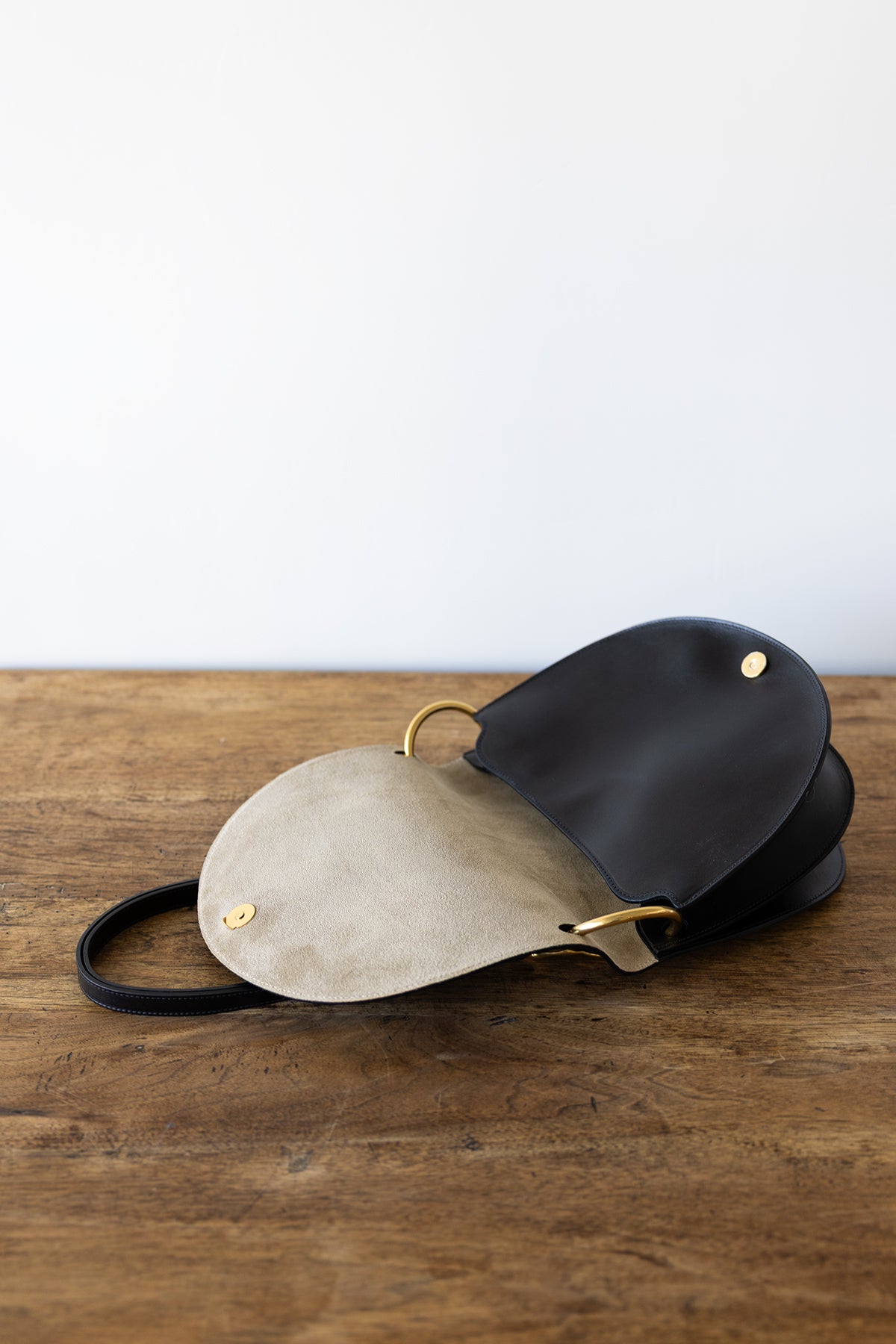 A modern classic, the Consuelo Crossbody is crafted from vegetable-tanned cowhide leather and finished with signature brass hardware. Bold circular rings frame the design, while the adjustable studded strap allows it to be worn crossbody or over the shoulder. The flap secures with a hidden magnetic snap, opening to an accordion-style interior lined in soft suede. Inside, dual open pockets keep cards and essentials neatly organized. Handmade in Italy with timeless craftsmanship and enduring style.