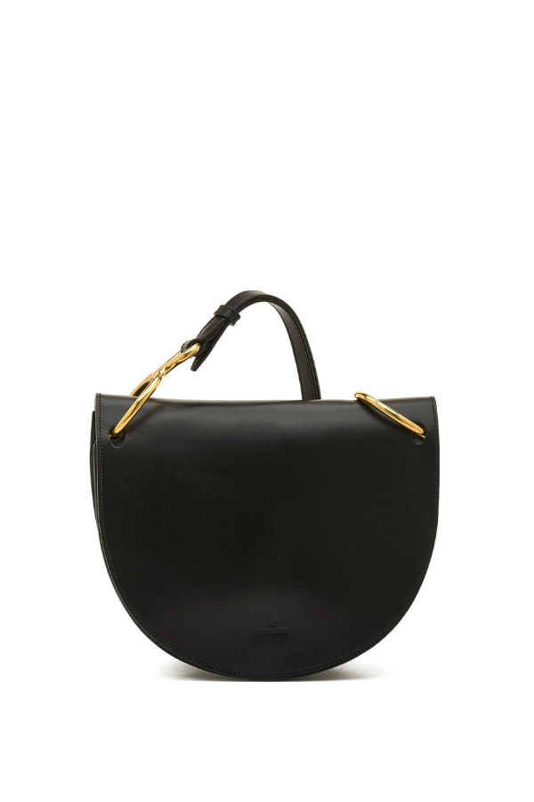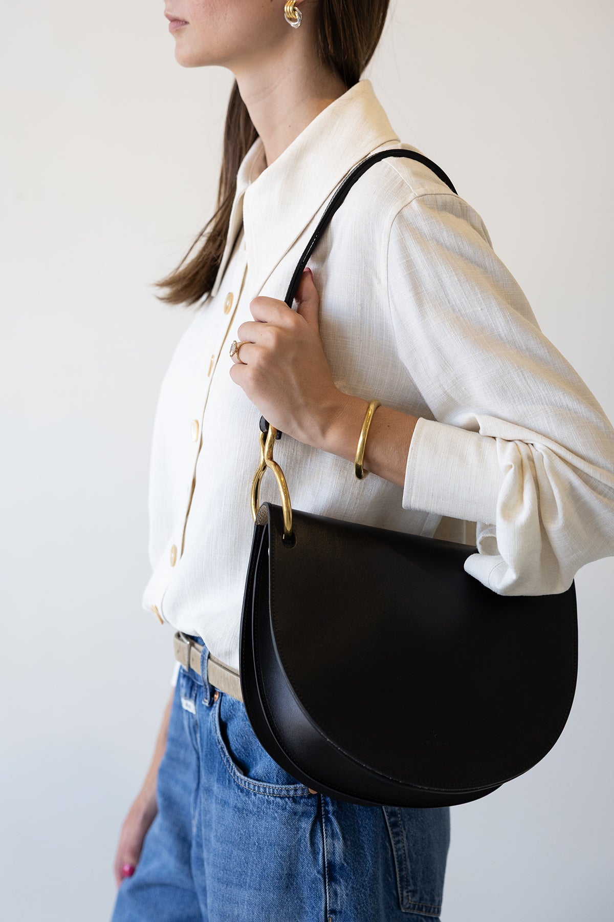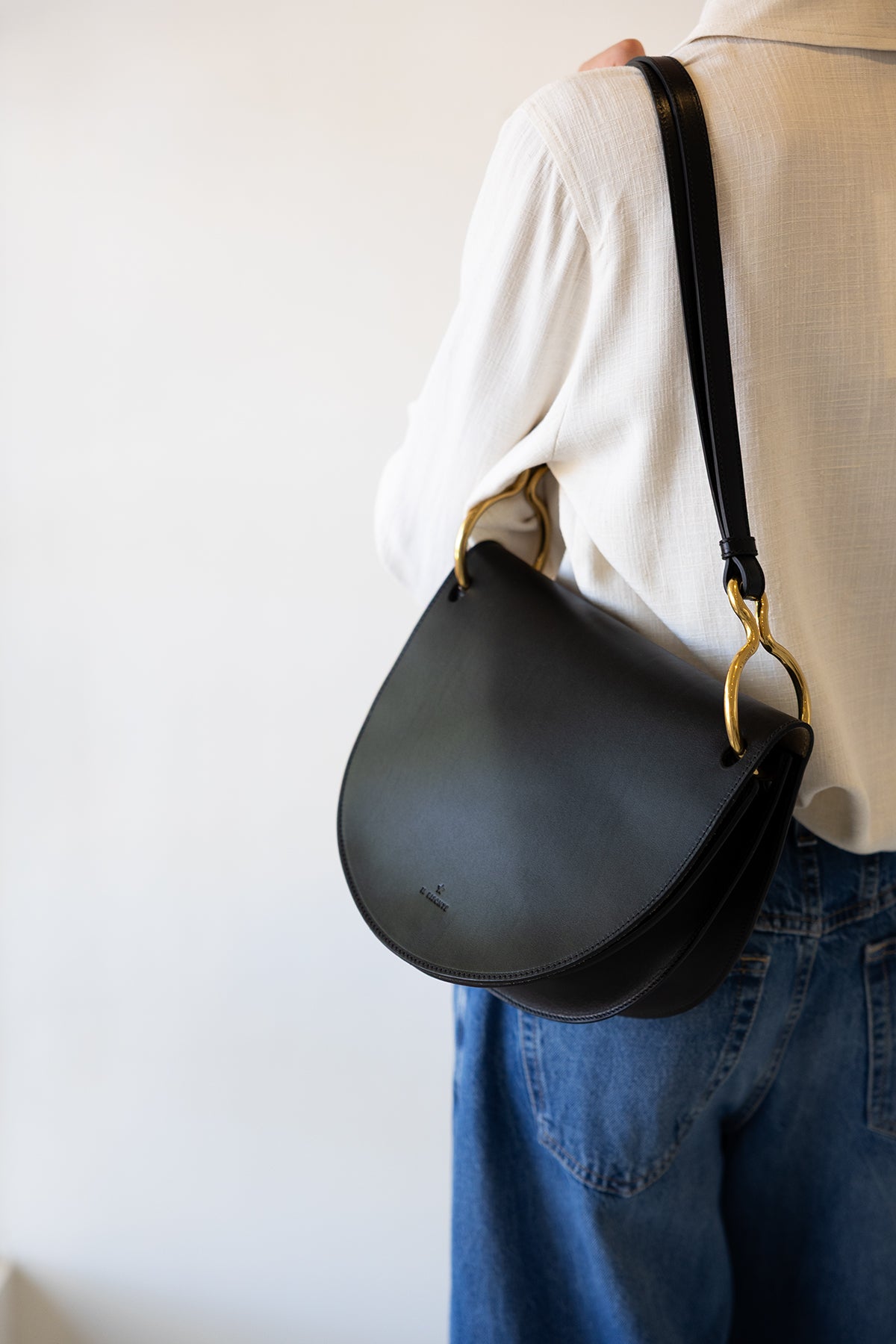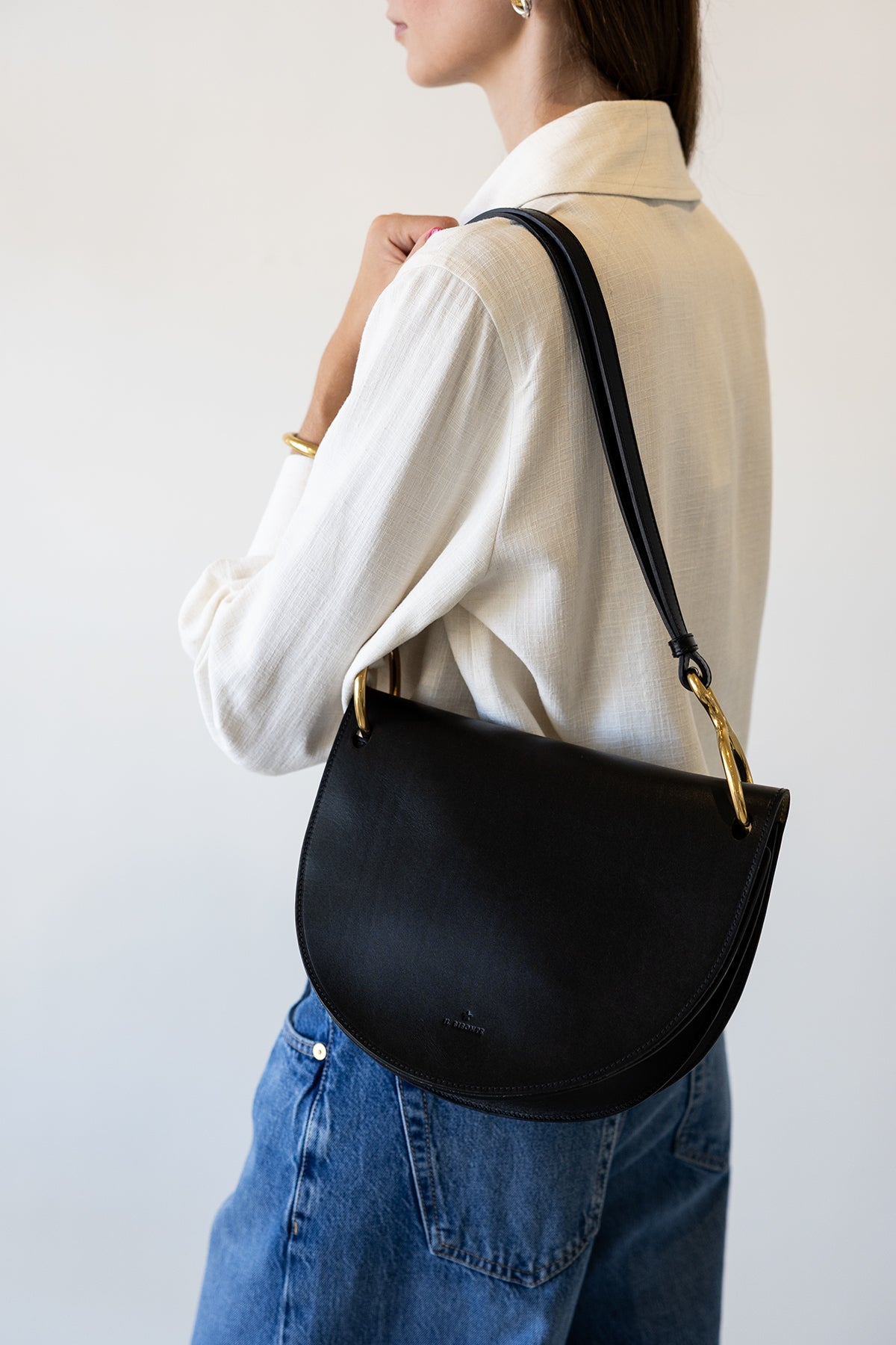 A modern classic, the Consuelo Crossbody is crafted from vegetable-tanned cowhide leather and finished with signature brass hardware. Bold circular rings frame the design, while the adjustable studded strap allows it to be worn crossbody or over the shoulder. The flap secures with a hidden magnetic snap, opening to an accordion-style interior lined in soft suede. Inside, dual open pockets keep cards and essentials neatly organized. Handmade in Italy with timeless craftsmanship and enduring style.