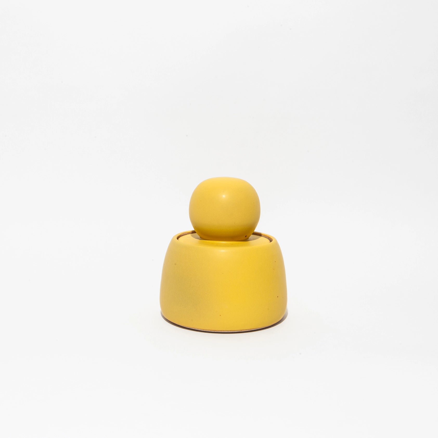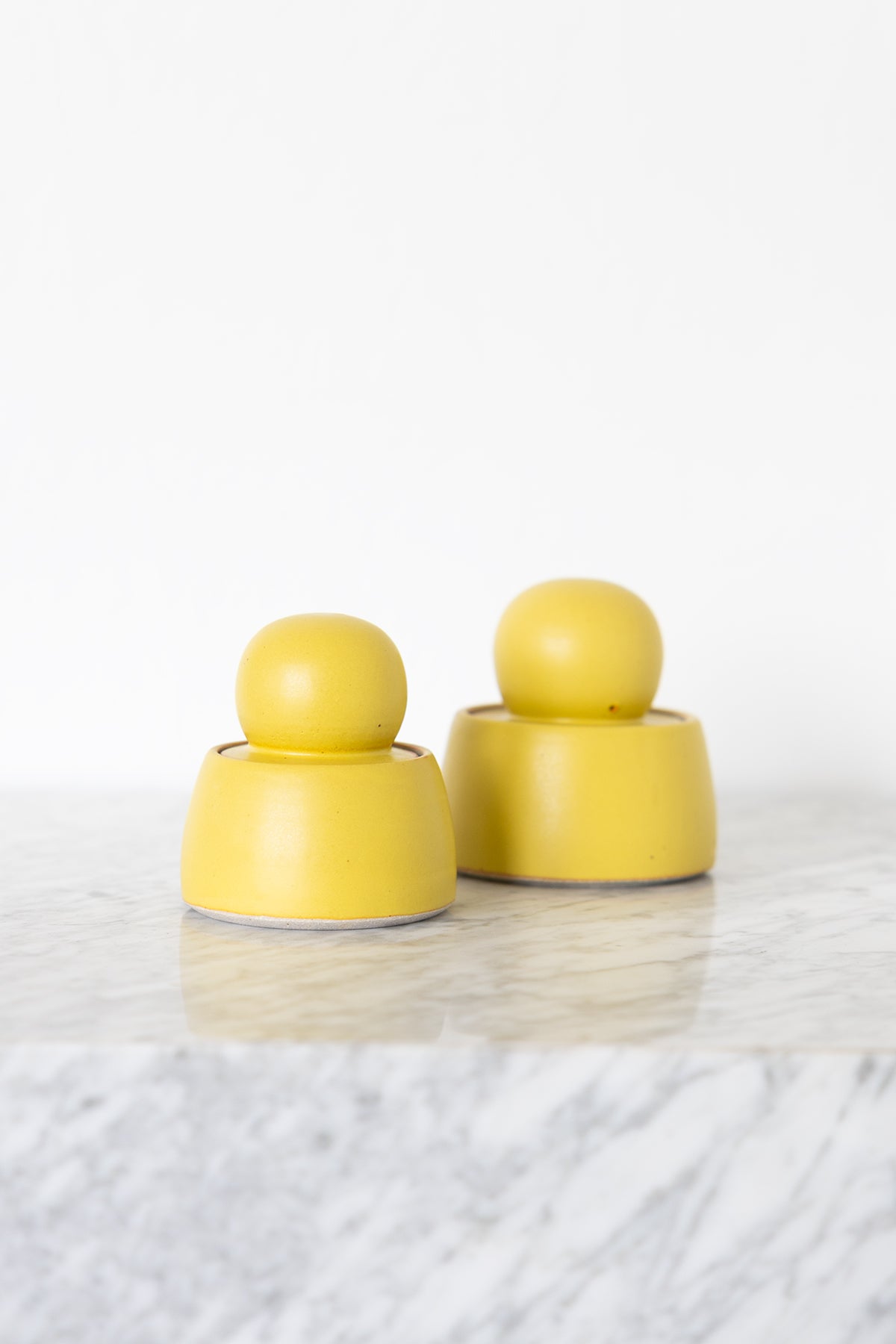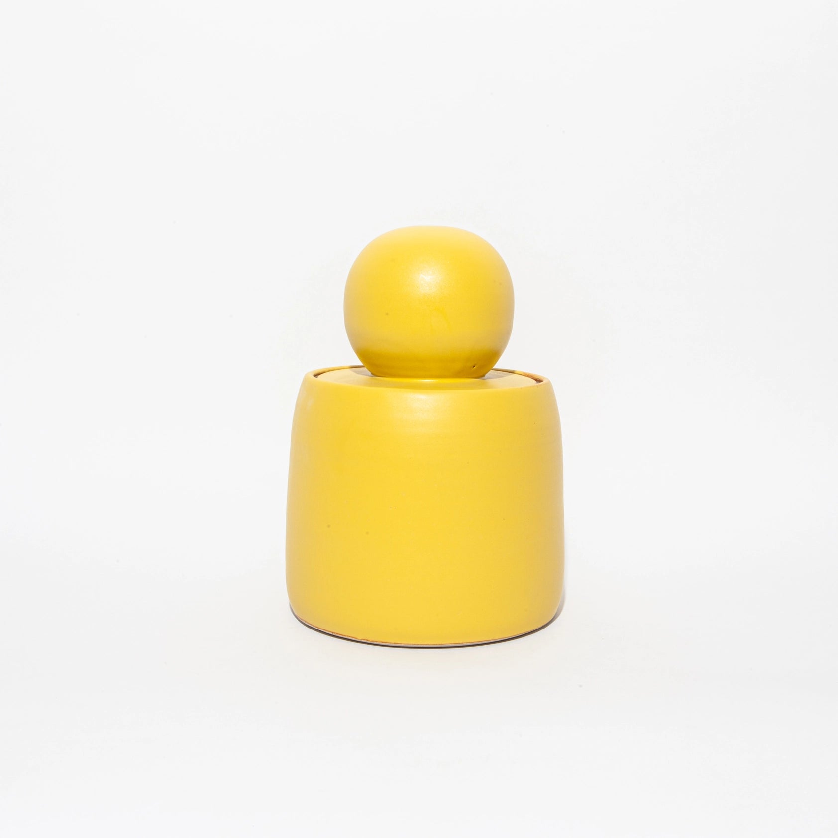 Our Popular stash jars now available in a sunny yellow glaze! Our hand thrown jars are accented with large chunky knobs and thrown from a white stoneware that highlights the bright saffron yellow color.