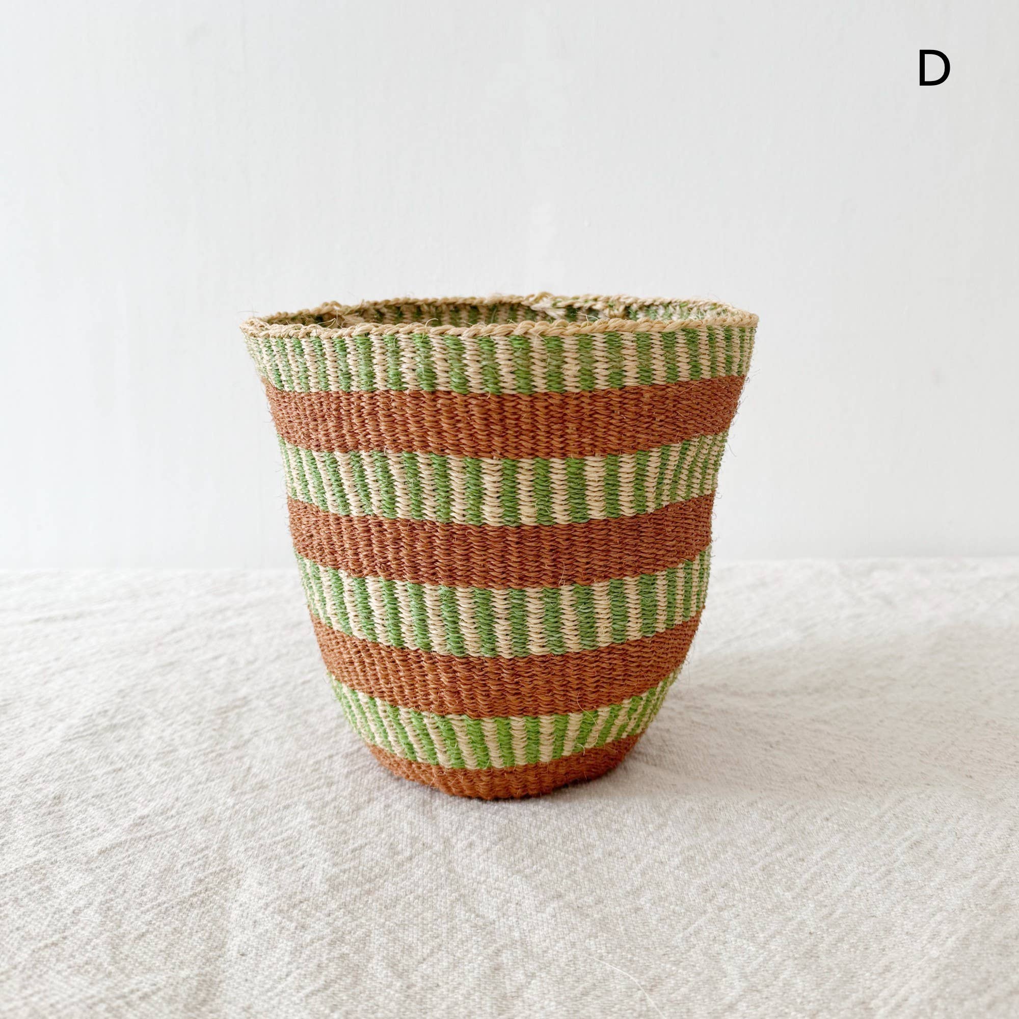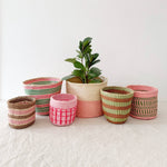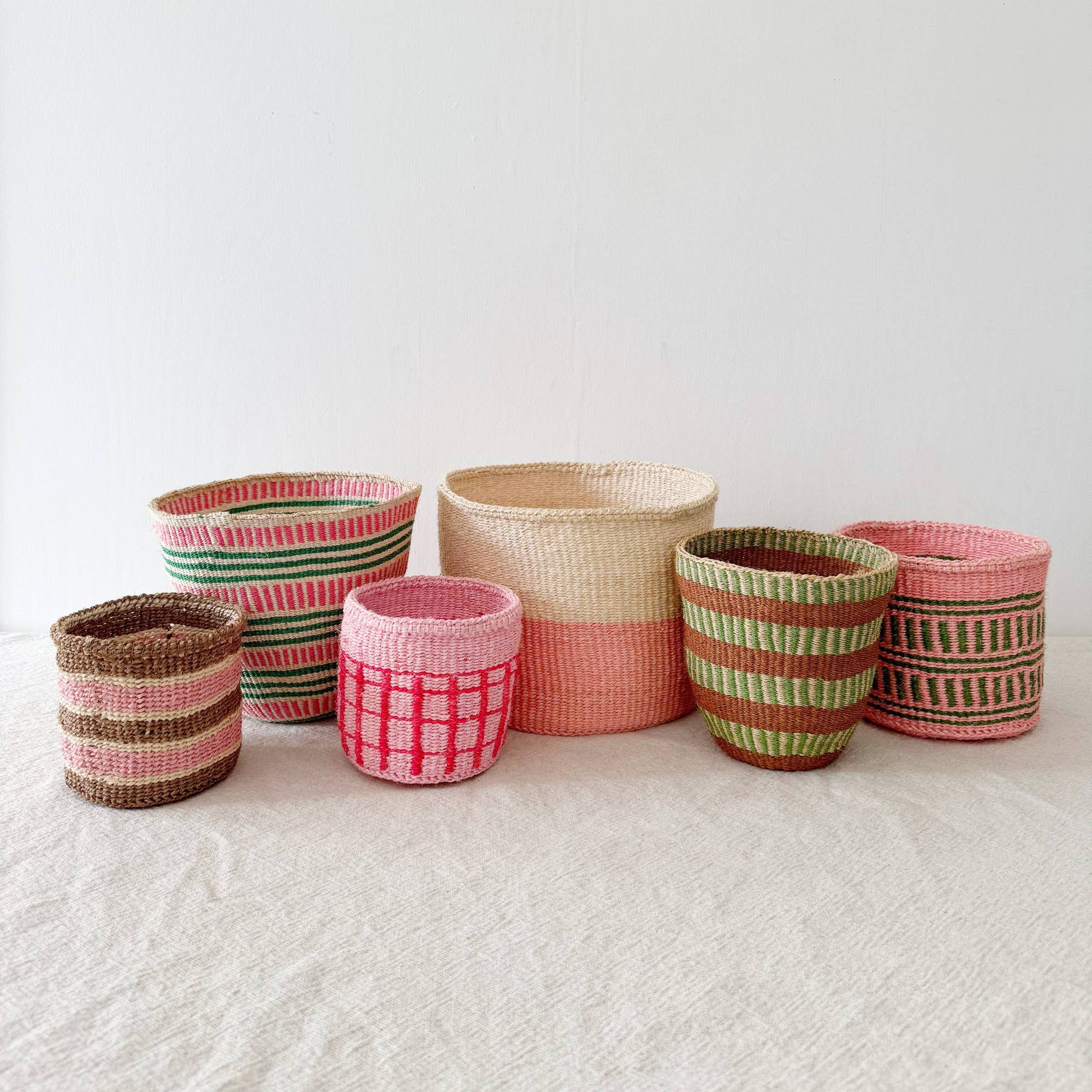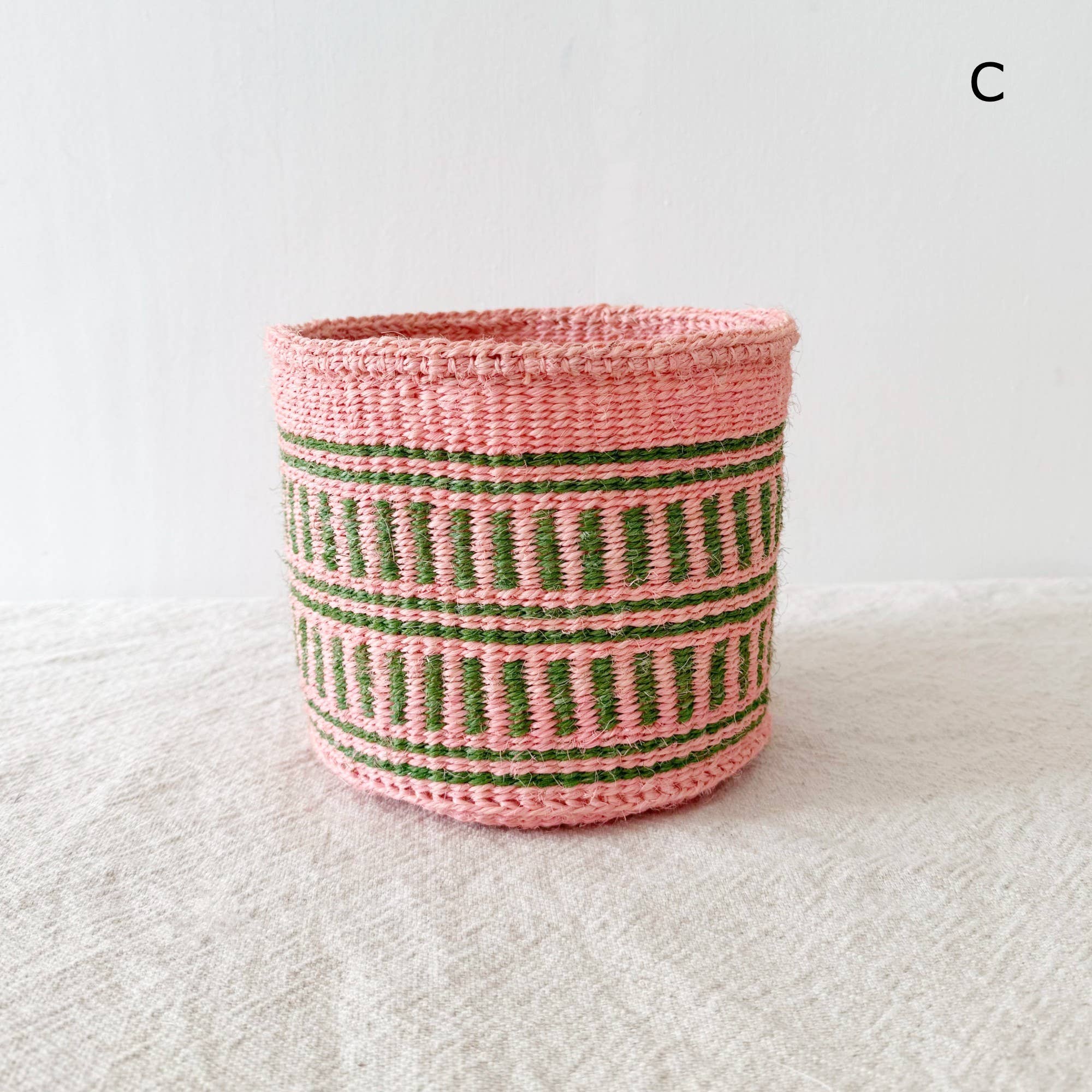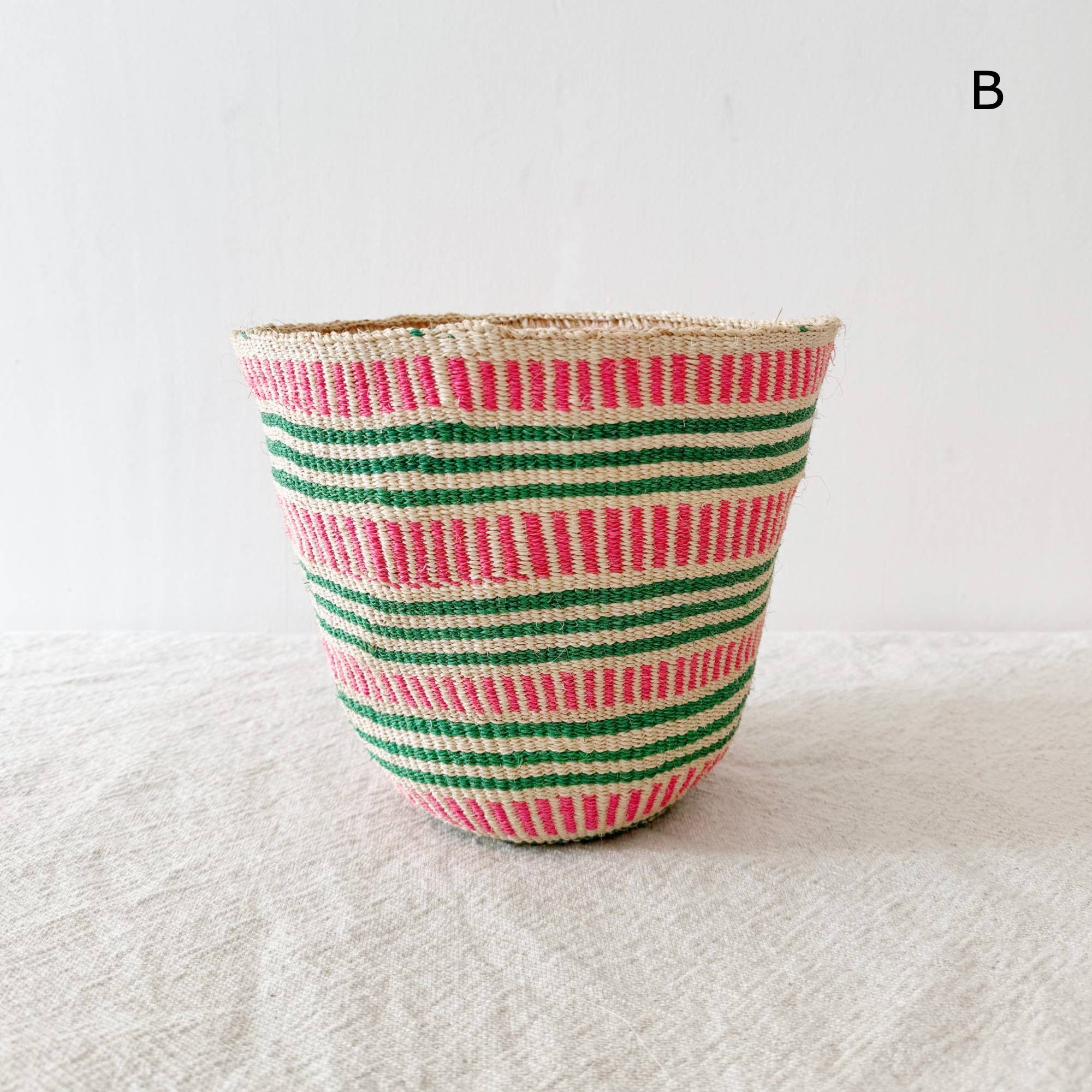 These sisal, woven baskets are handmade by a weaving cooperative in southeastern Kenya. The women hand-dye the sisal fibers and weave them into these beautiful works of art. Use this African basket as a plant holder, for storage, or to brighten up a shelf!