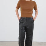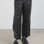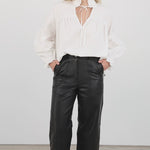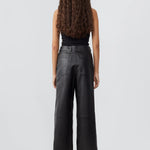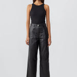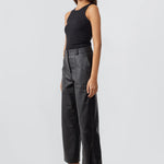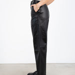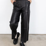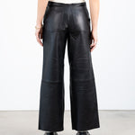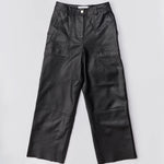 Wide straight cut leather pants with a high waist, zip fly, and workwear inspired front pocket detail. Flattering jean style back pockets.