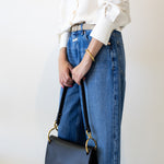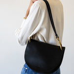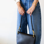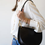 A modern classic, the Consuelo Crossbody is crafted from vegetable-tanned cowhide leather and finished with signature brass hardware. Bold circular rings frame the design, while the adjustable studded strap allows it to be worn crossbody or over the shoulder. The flap secures with a hidden magnetic snap, opening to an accordion-style interior lined in soft suede. Inside, dual open pockets keep cards and essentials neatly organized. Handmade in Italy with timeless craftsmanship and enduring style.
