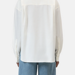 The oversized shirt blends cotton and cashmere for a soft, subtly sheer finish. Features a chest pocket with diagonal signature stitching, mother-of-pearl buttons, a curved hem, and a box pleat at the back yoke.