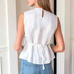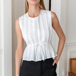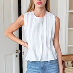 This elegant long top combines linen and viscose for a lightweight, breathable feel. It features a curved bound neckline and a keyhole opening at the back secured with a button. Pleated detailing at the front shapes the waistline beautifully, while side seam ties allow for a customizable fit.