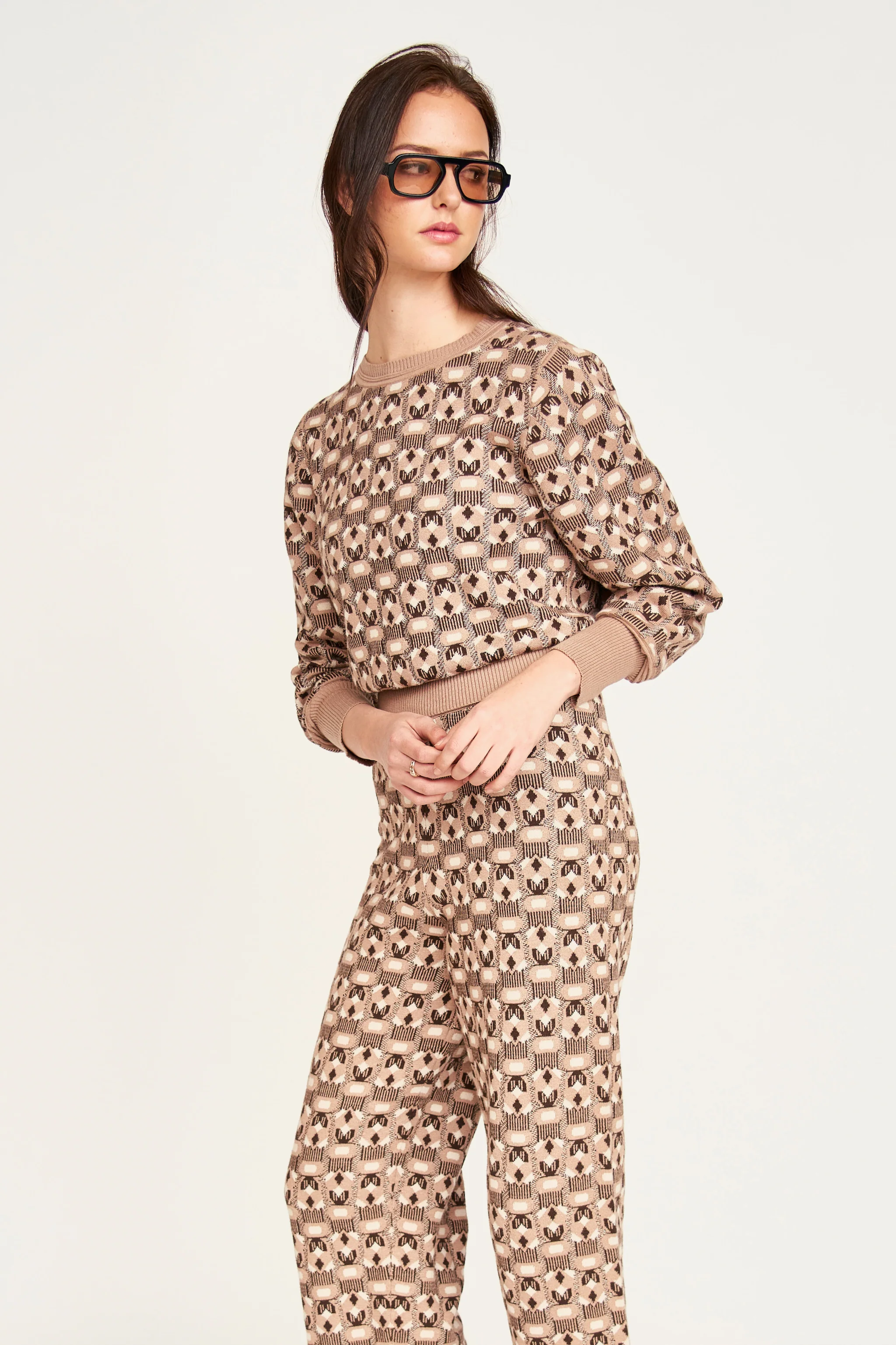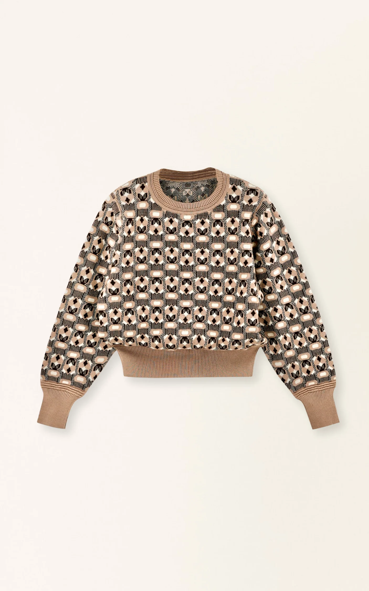 An effortless knit made for modern ease. This cropped sweater features a subtle geometric pattern in warm, neutral tones, balanced by ribbed trims at the neckline, cuffs, and hem. The relaxed silhouette and slightly voluminous sleeves bring just the right amount of structure, making it a versatile piece that feels polished yet laid-back.