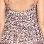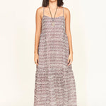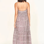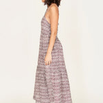 This ankle-length dress features a soft V neckline, adjustable rouleau tie straps, a gathered tiered skirt, side pockets, and a gathered elastic back for a comfortable, flattering fit.