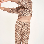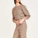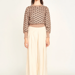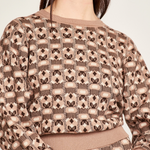 An effortless knit made for modern ease. This cropped sweater features a subtle geometric pattern in warm, neutral tones, balanced by ribbed trims at the neckline, cuffs, and hem. The relaxed silhouette and slightly voluminous sleeves bring just the right amount of structure, making it a versatile piece that feels polished yet laid-back.