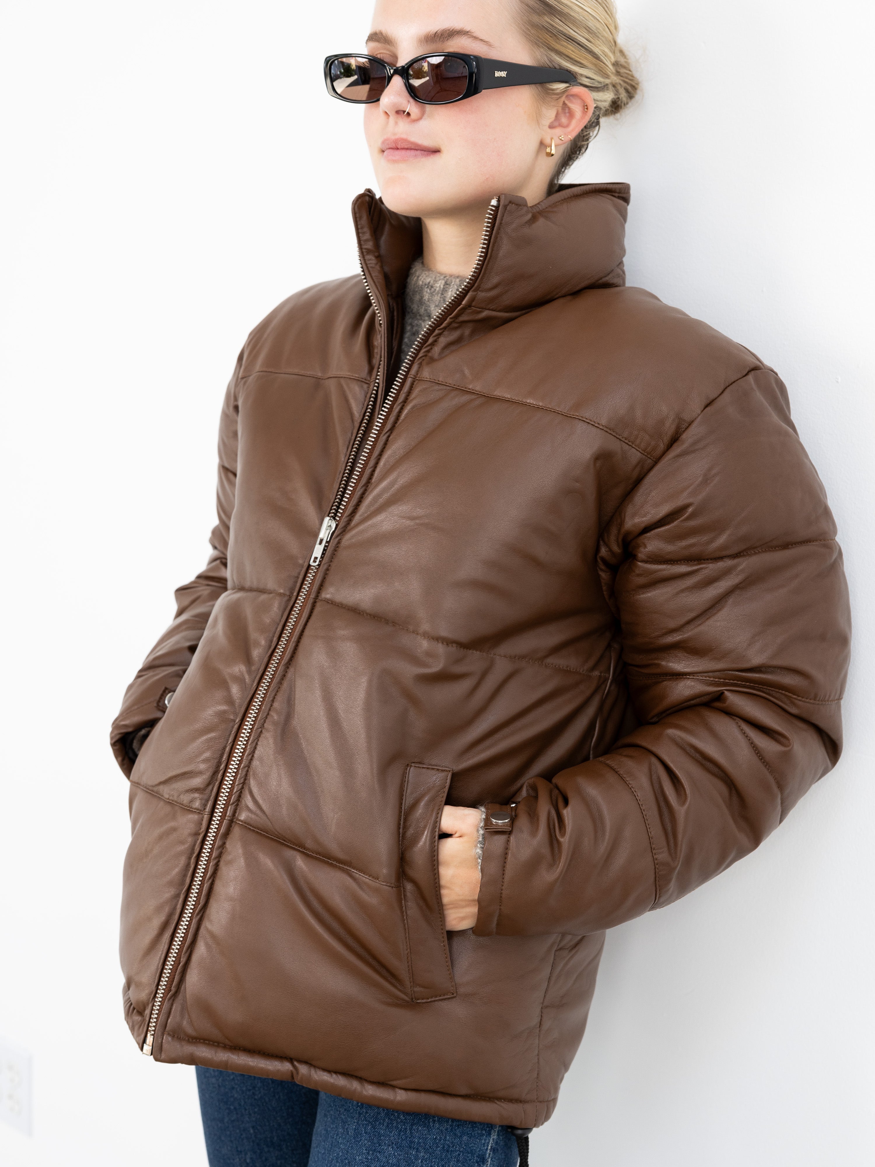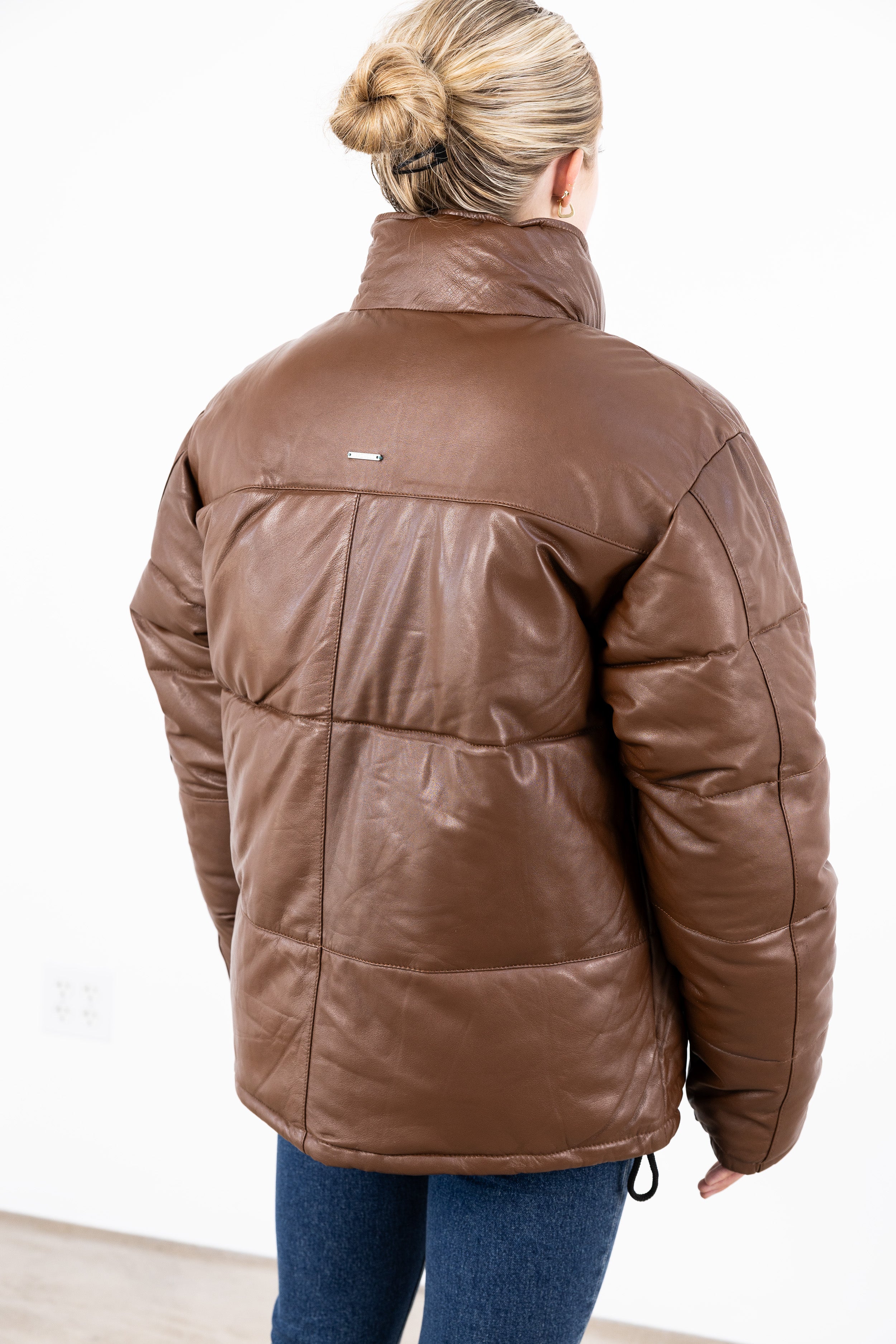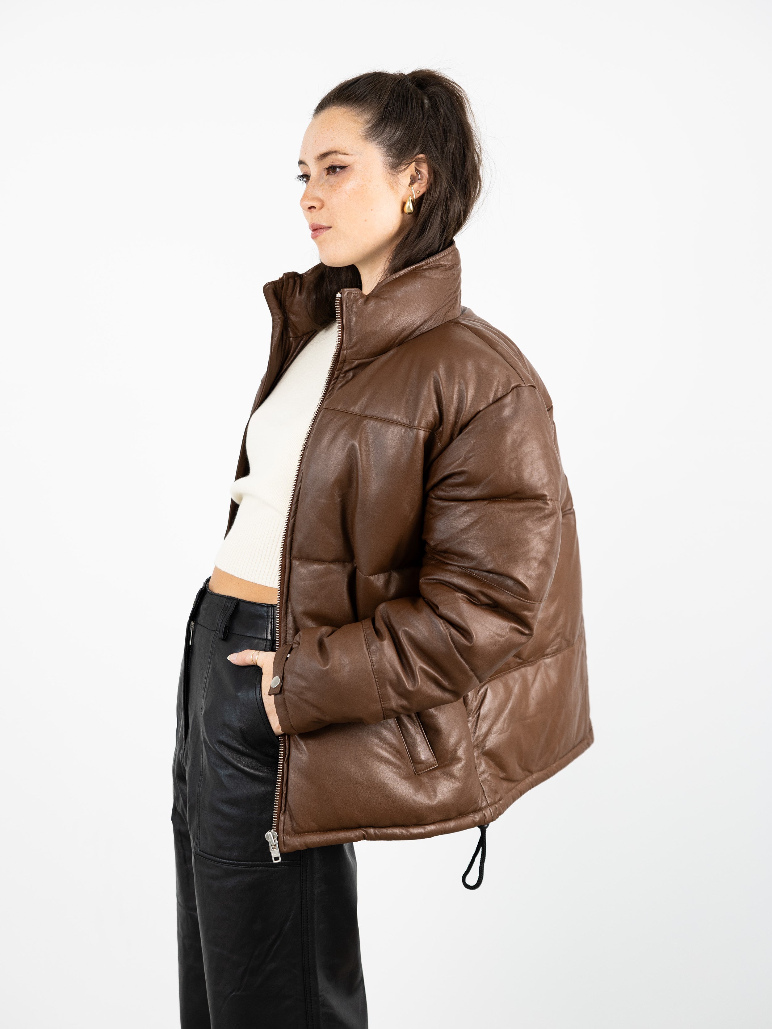 Stunning, down-free, leather puffer jacket with zipper closure at center front and waist pockets. Features an inside pocket and drawstring at hem.