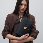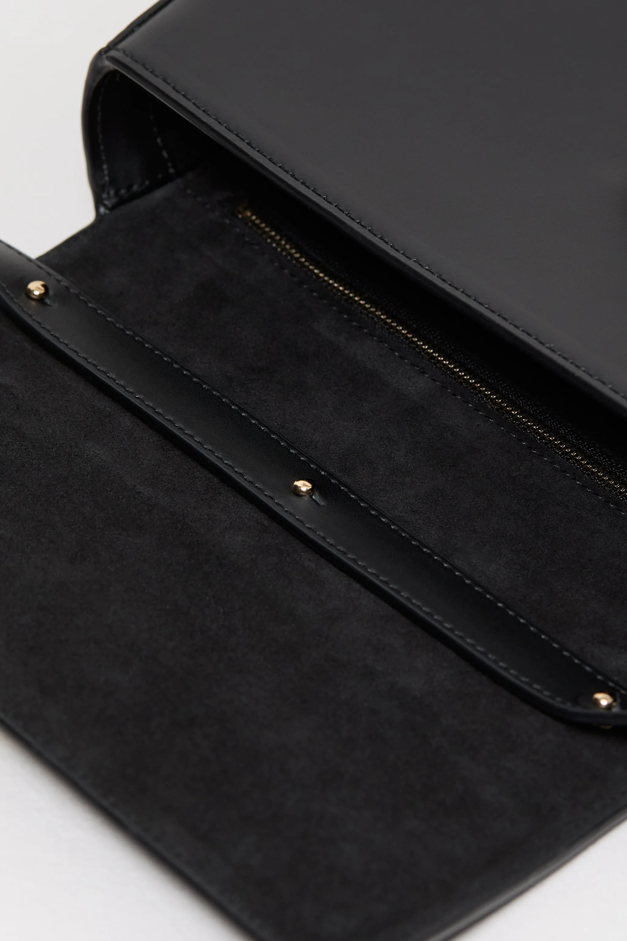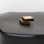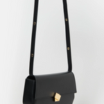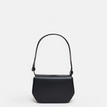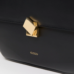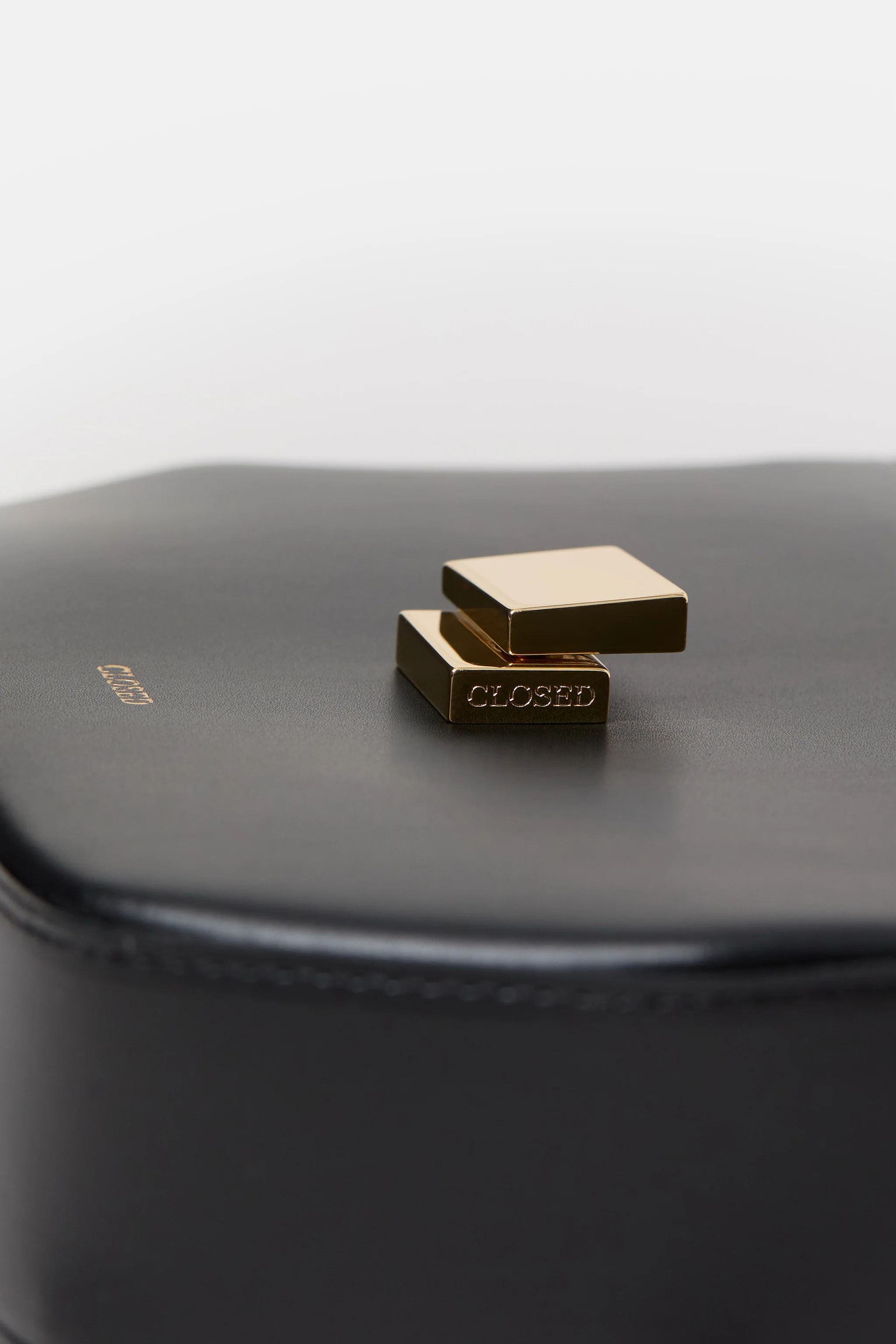 A black leather shoulder bag with a metal buckle, an adjustable strap, and the CLOSED logo embossed on the front.
