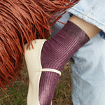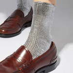 A seasonless staple from Maria La Rosa, these silk ribbed socks are lightweight yet insulating — keeping you cool in summer and warm in winter. Finished with a metallic foil overlay, they shimmer with elegance and gradually reveal the silk beneath over time. Perfect for parties or anytime you want to stand out.