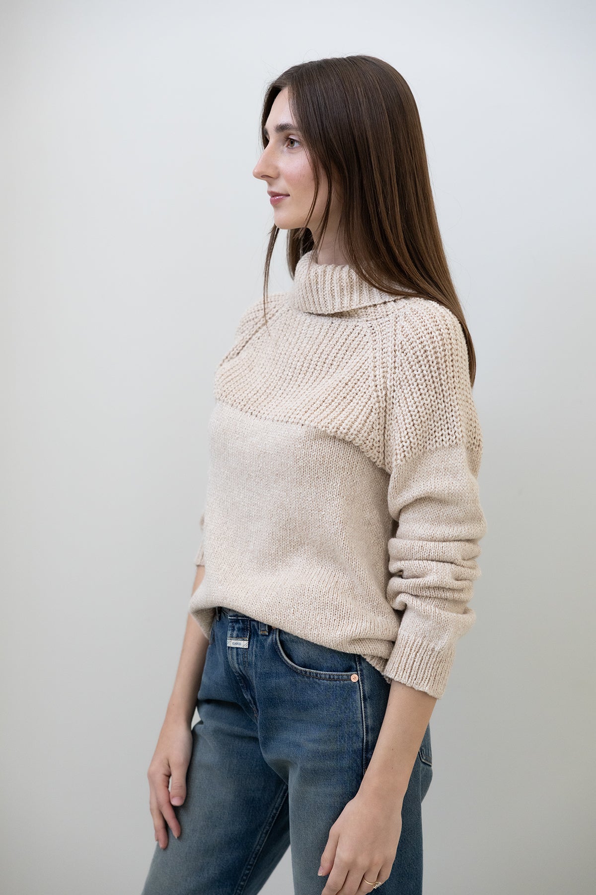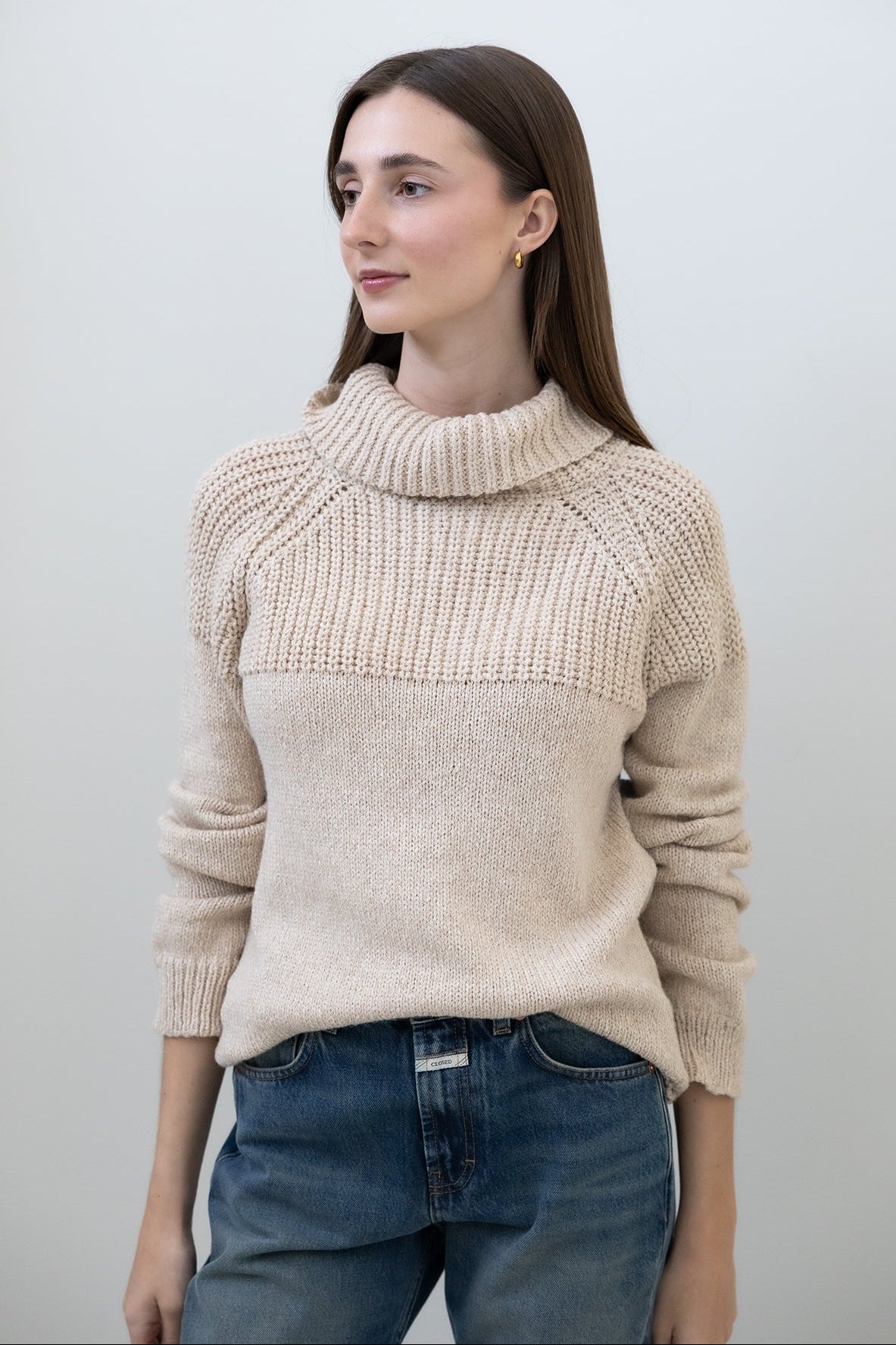 This turtleneck sweater is knitted from soft baby alpaca and cotton yarn. Chunky rib details in the shoulder area and ribbed cuffs. Light-weight knit