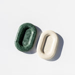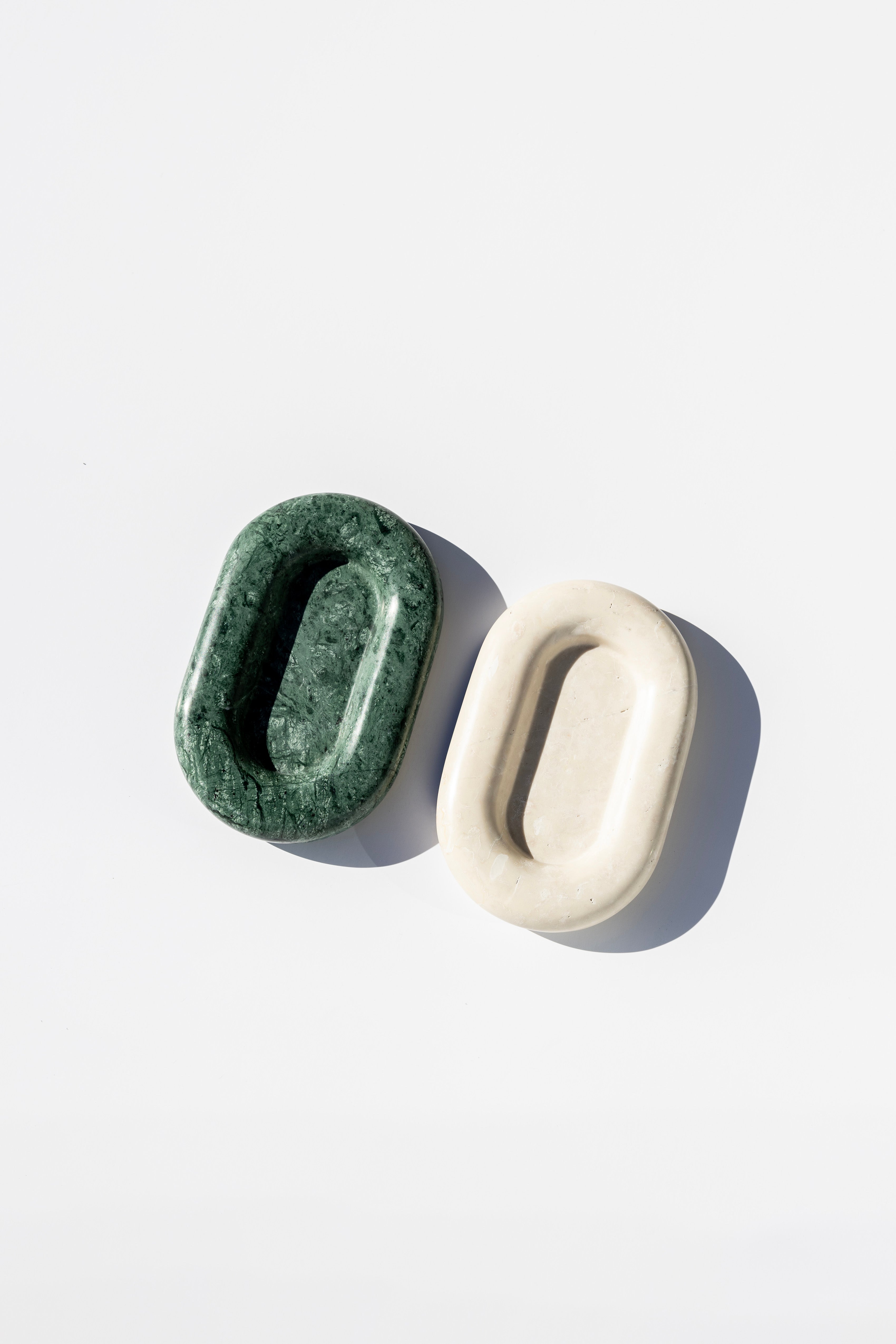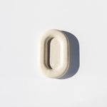The Maddi is a chunky, six-inch oval catchall cut from a single piece of solid marble or stone with a large, playfully modern “puffed” border, hand-finished by artisans in a growing stone atelier in Rajasthan, India.