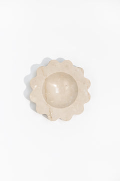 The Maddi is a chunky, six-inch oval catchall cut from a single piece of solid marble or stone with a large, playfully modern “puffed” border, hand-finished by artisans in a growing stone atelier in Rajasthan, India.