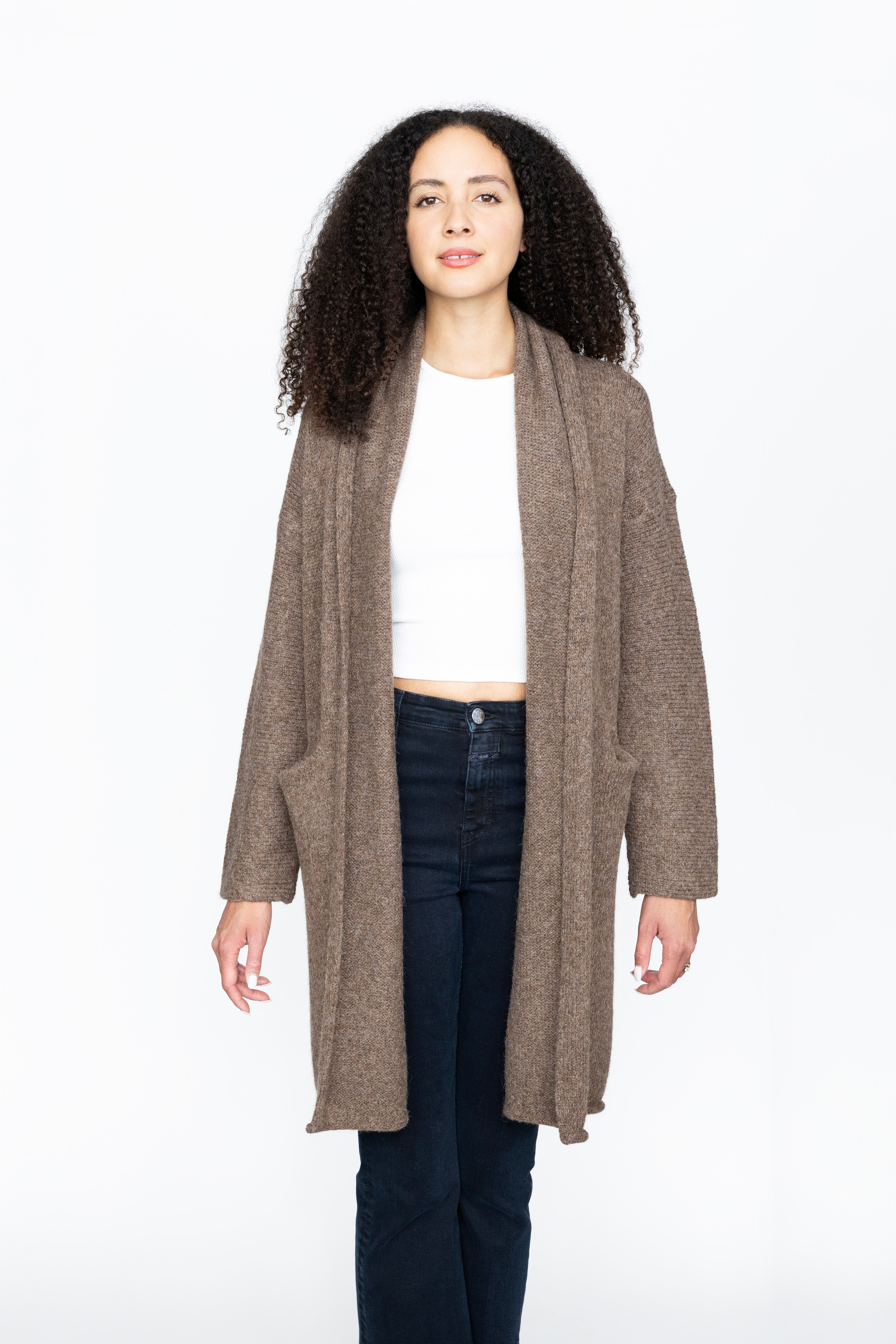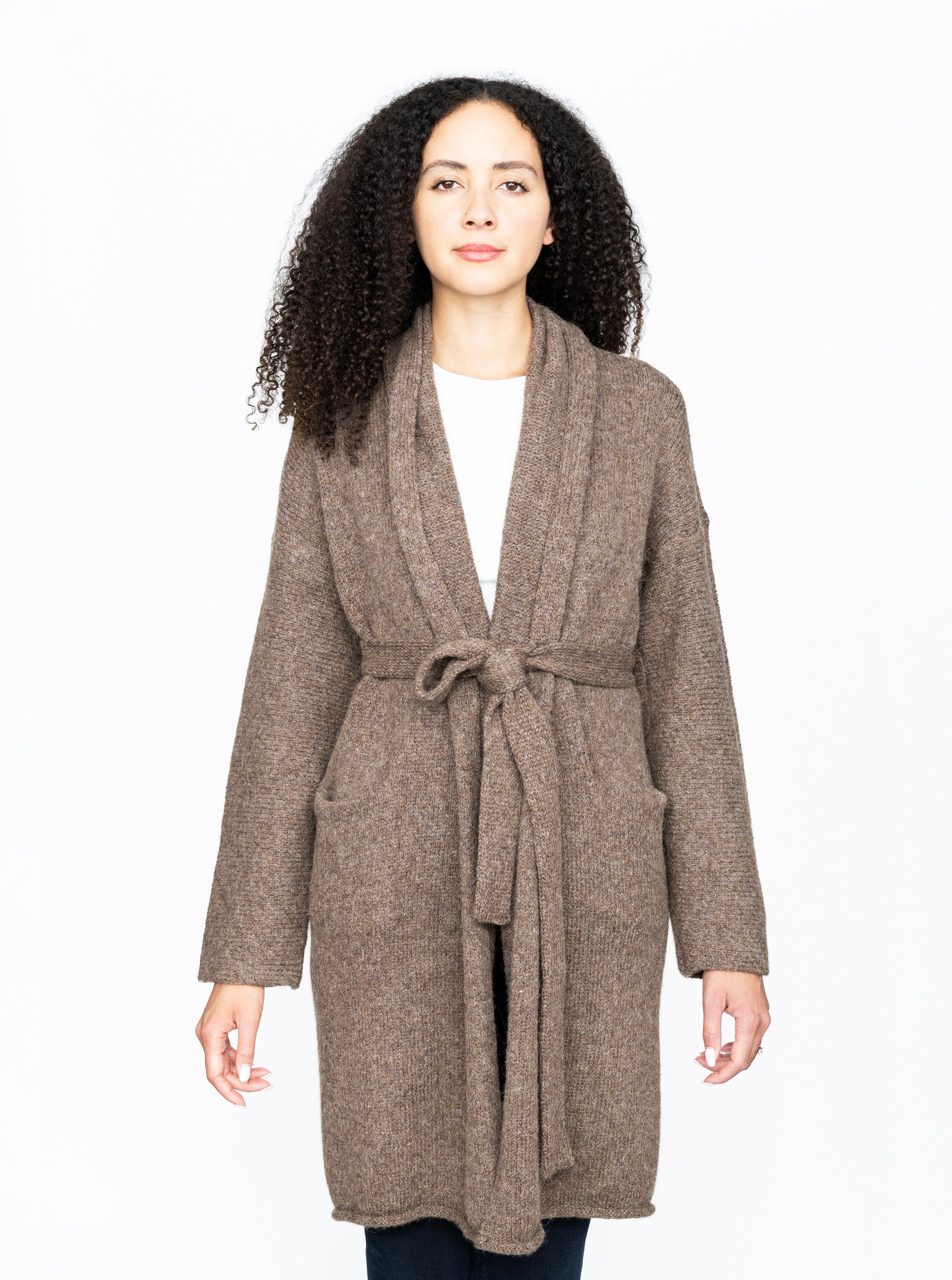 Our first in-house label, the Parker Sweater Coat crafted in partnership with producers in Peru with fair trade and sustainability as one of its core points. With a luxuriously soft and cozy alpaca wool blend, the Parker Coat in classic Capote style has an easy, effortless fit and a minimalist silhouette. Featuring dropped shoulders, two knitted front pockets, and an optional knitted belt for cinching, the Parker pairs beautifully with all your go-to closet staples--like jeans and a turtleneck, tank, or tee.