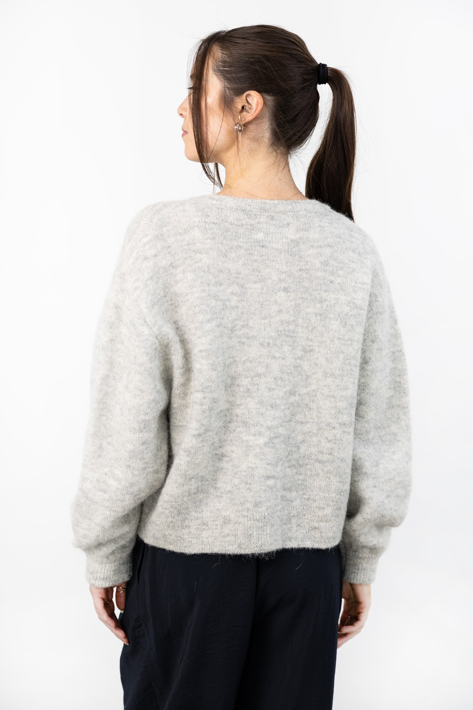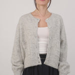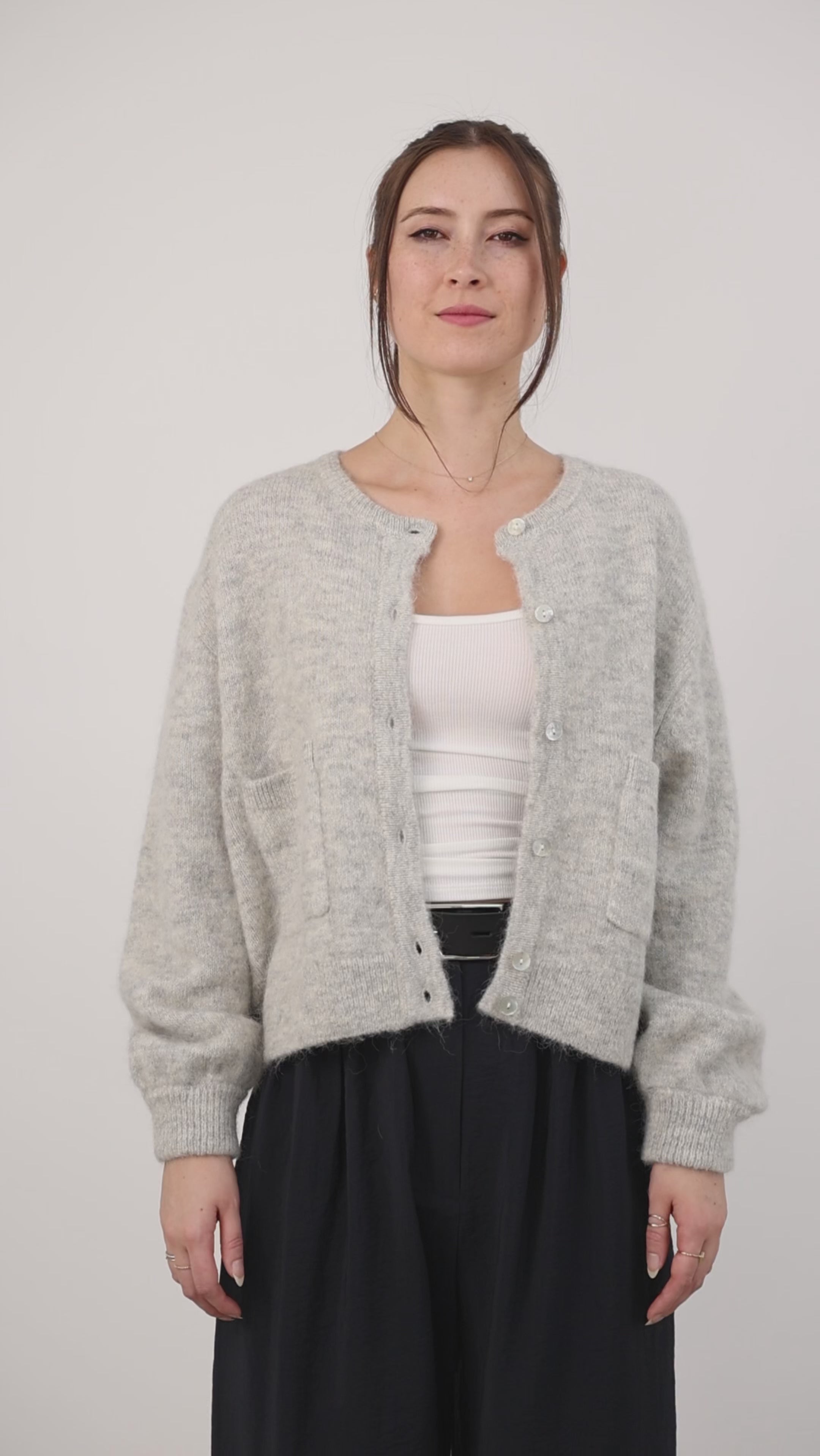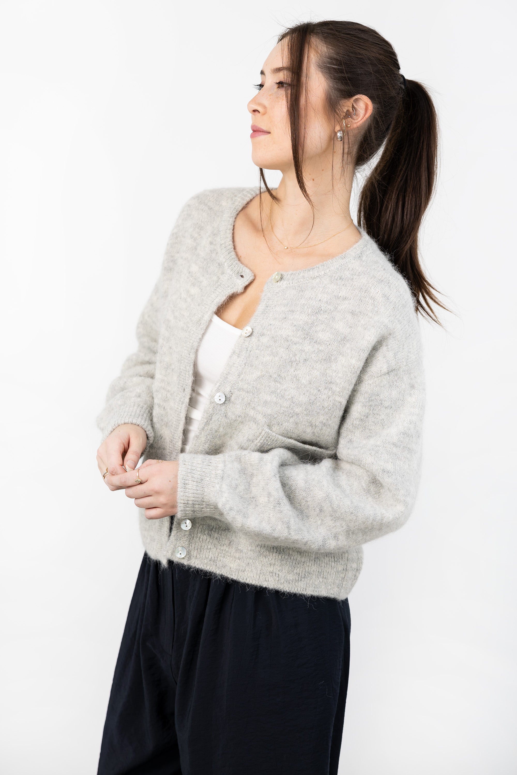 The Amélie Alpaca Cardigan is a fresh take on the classic cardigan, crafted from a soft alpaca-wool blend for a cozy yet refined feel. Designed with natural shell buttons and two front pockets, it combines functionality with style. Its slightly oversized silhouette and balloon sleeves provide a relaxed, comfortable fit while maintaining an elegant appearance.