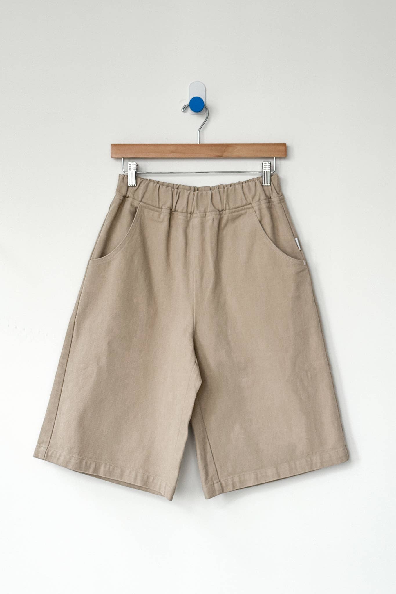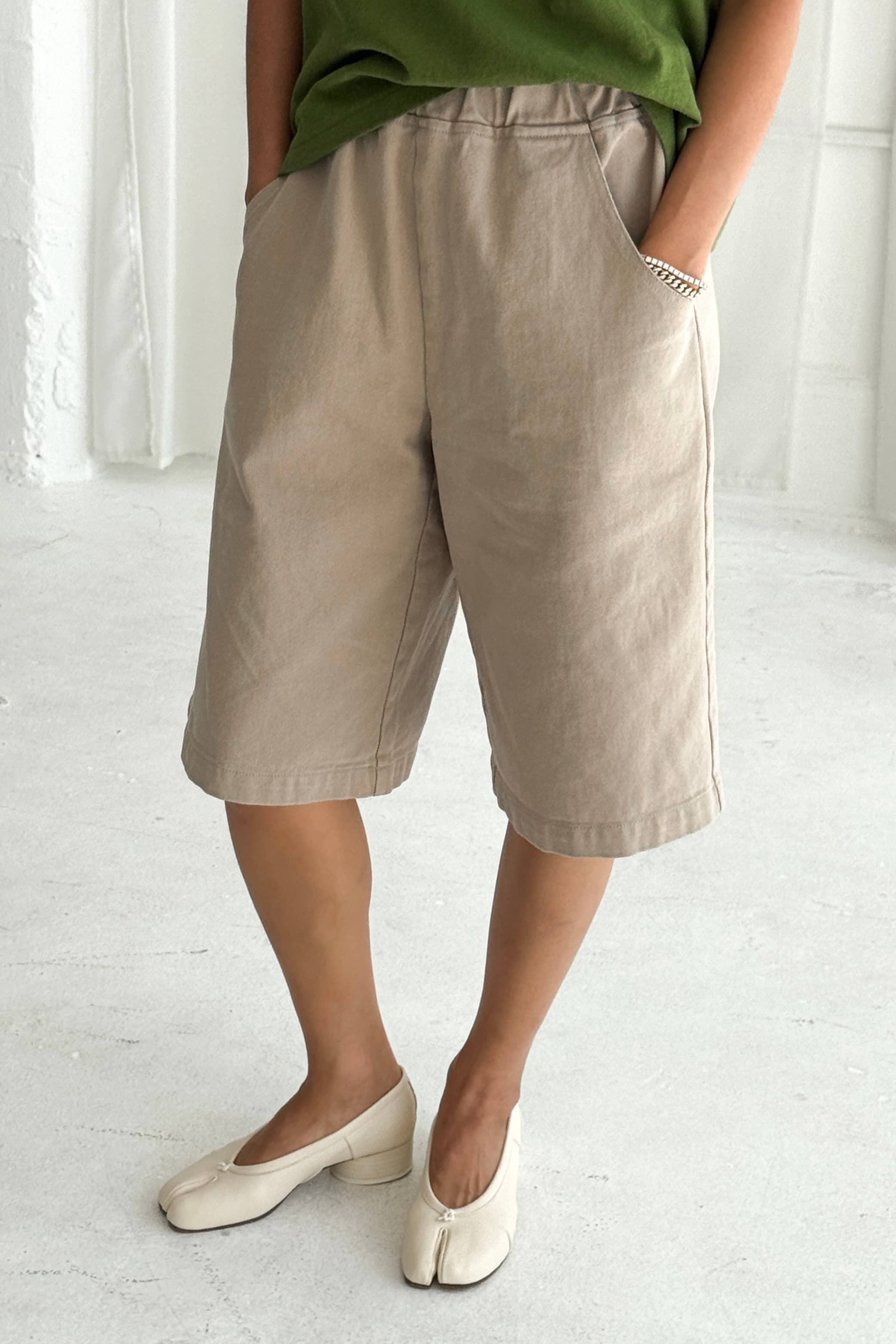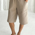 The Liam Shorts offer a modern twist on the classic Bermuda. They feature an elasticated waistband for comfort, side seam pockets, and a relaxed fit with slightly flared panels for added shape. The elongated inseam and subtle A-line silhouette make them easy to wear from day to night.