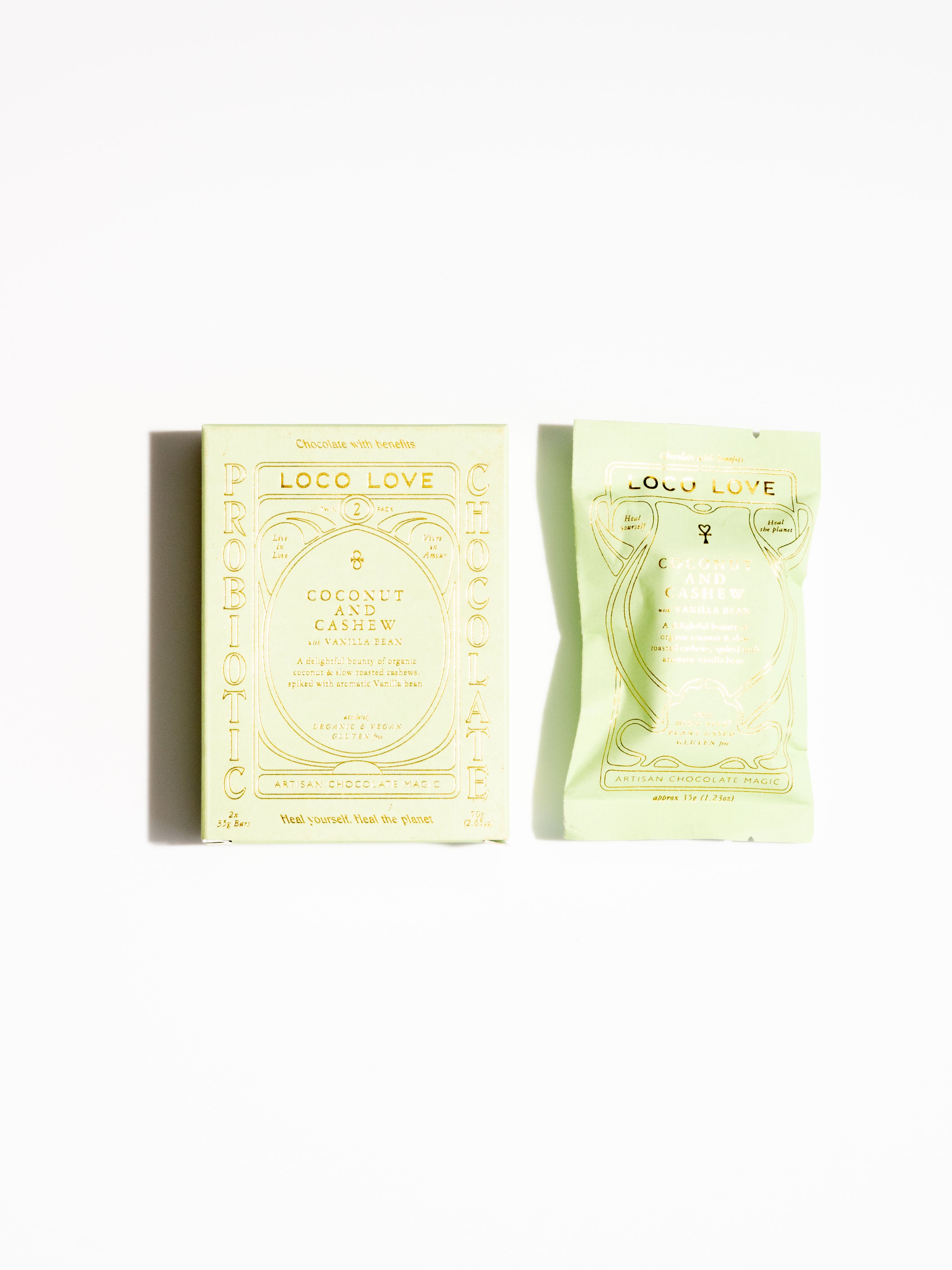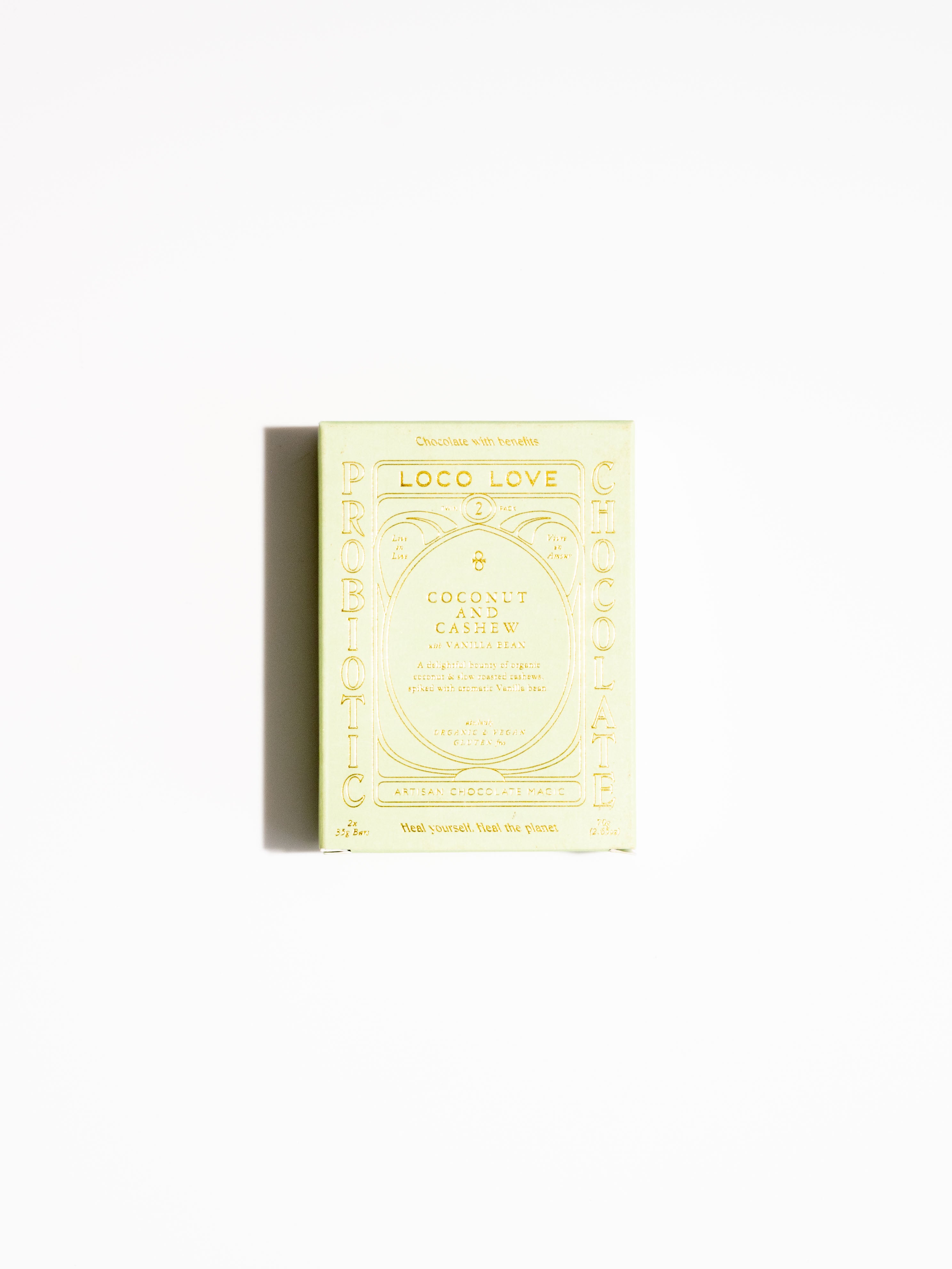- Ingredients: Cacao paste*, coconut*, cashews* (12.1%), cacao butter*, coconut blossom sugar*, brown rice syrup*, vanilla powder* (1%), Bacillus coagulans, Australian sea salt | Contains cashews | Cacao solids 25.1%" | *ORGANIC INGREDIENTS