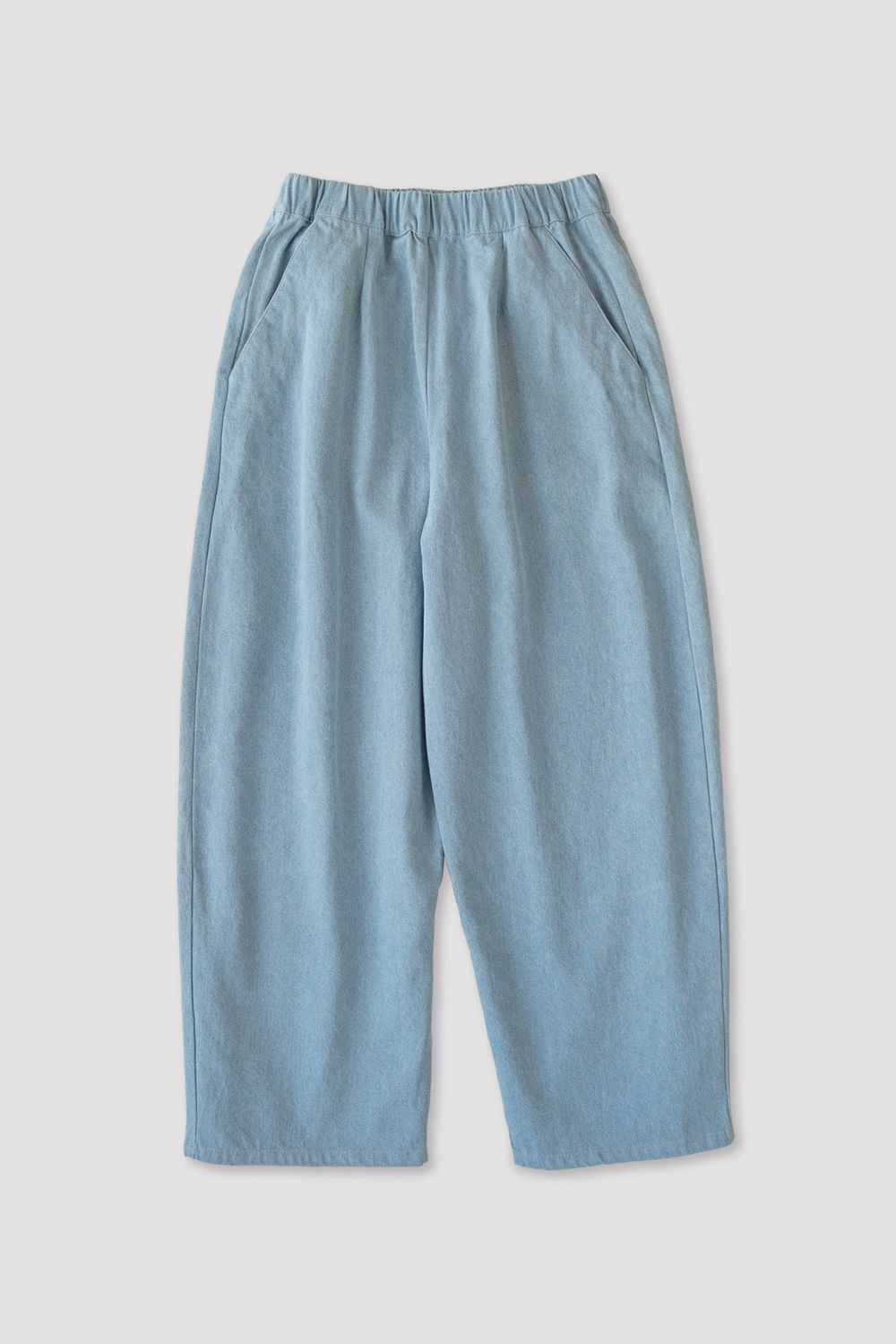 Easy silhouette designed with a longer rise and a slight curved leg and cropped length. Details include mini dart at front panel, side pockets, an elasticated waistband, and two patch pockets at the back.
