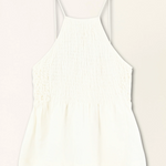 Smocked, hip-length halter top with smocking at bodice and elastication at sides.