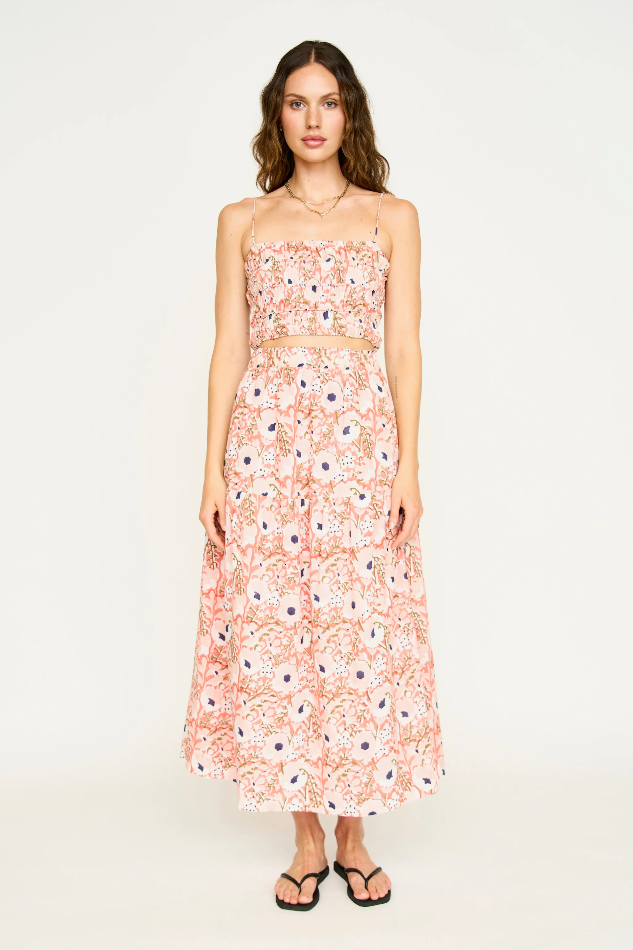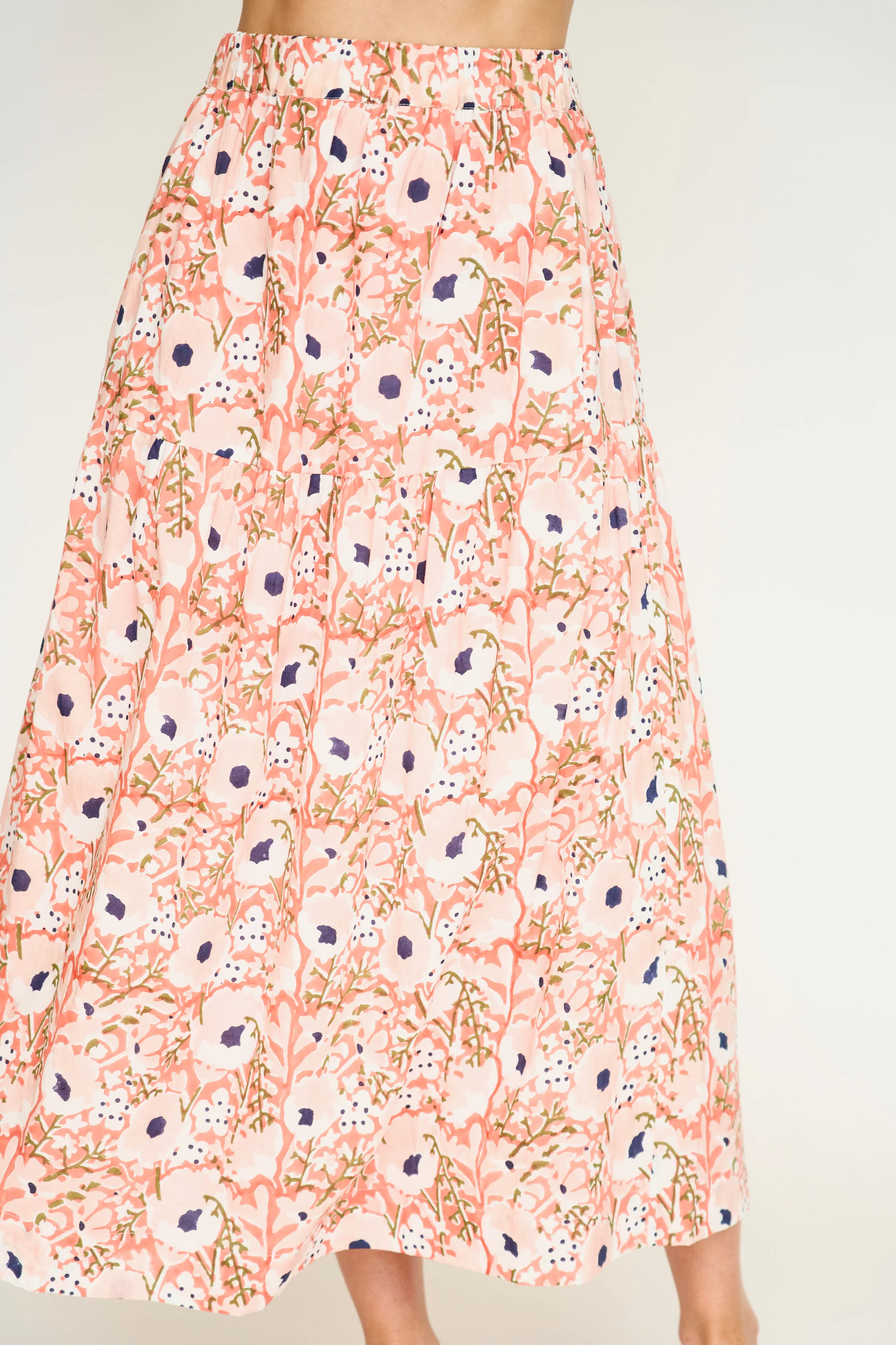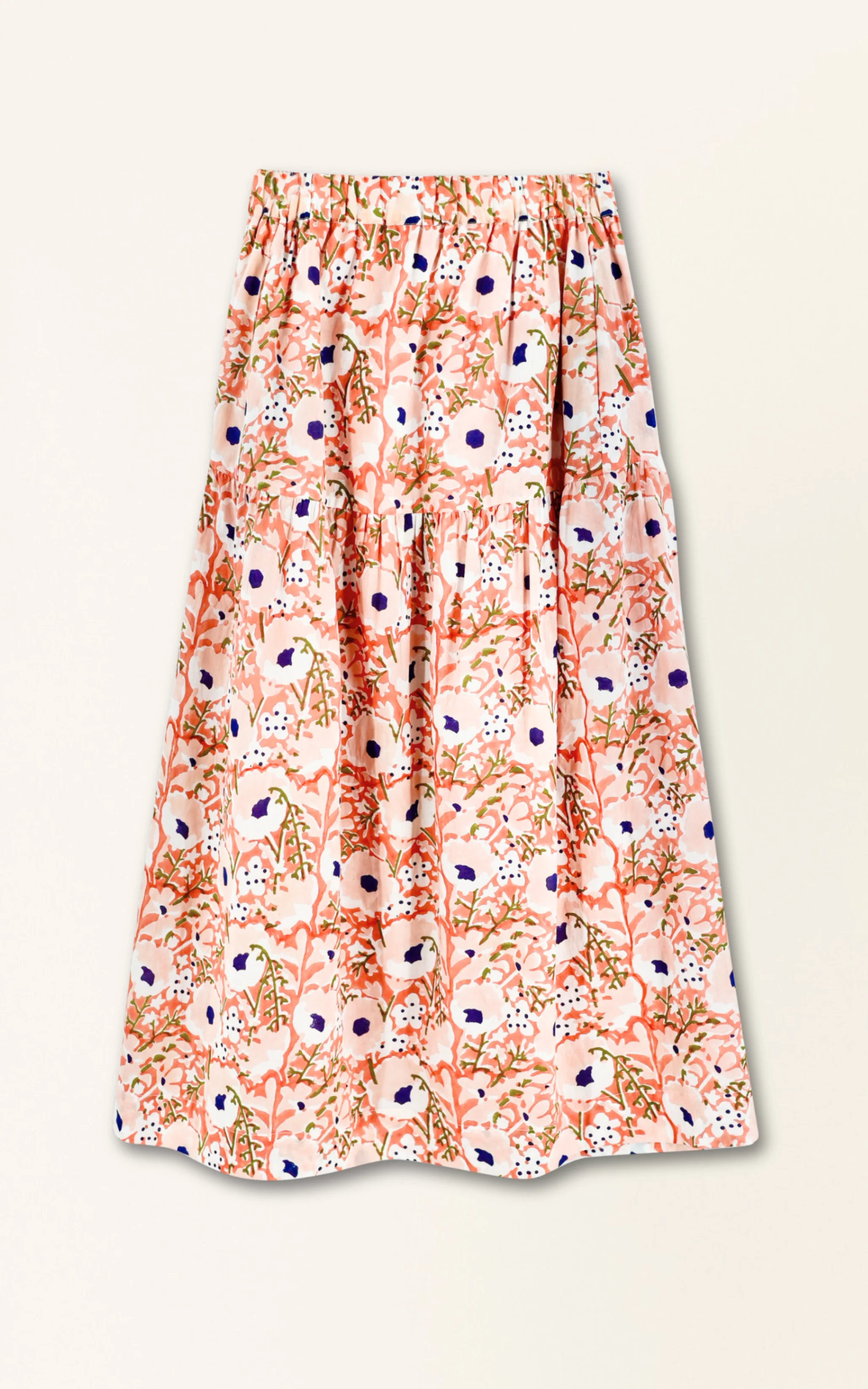 Soft and evenly gathered long, tiered skirt with a wide elastic waistband.