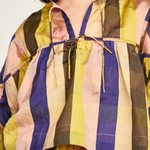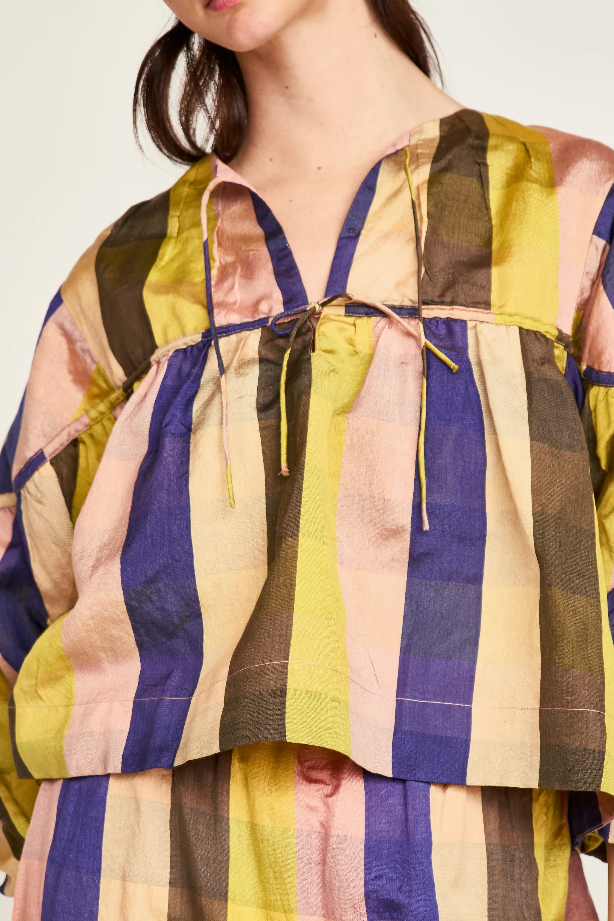 A relaxed cotton-silk blouse featuring a front neck slit with tie closure and delicate button details along the front. Designed with a gathered yoke and bubble elastic cuffs for a soft volume through the sleeves.