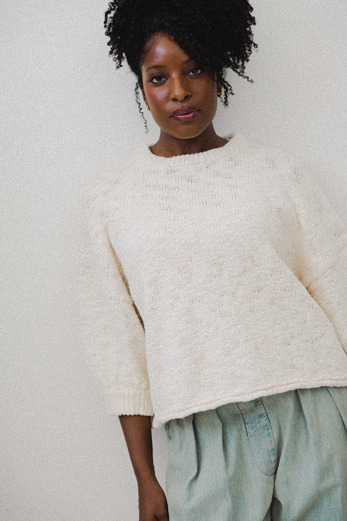 Effortless comfort with a cool-girl edge. This relaxed ivory sweater features softly rolled ¾ sleeves and a laid-back silhouette that feels both casual and refined. Knit from a cozy cotton that’s soft to the touch and easy to wear, it’s the perfect piece to anchor your everyday wardrobe.